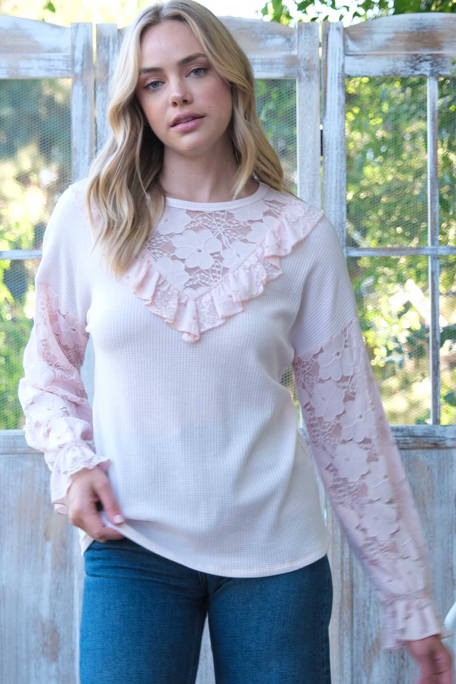 Color-blocked knit top with crochet lace trim-IT528