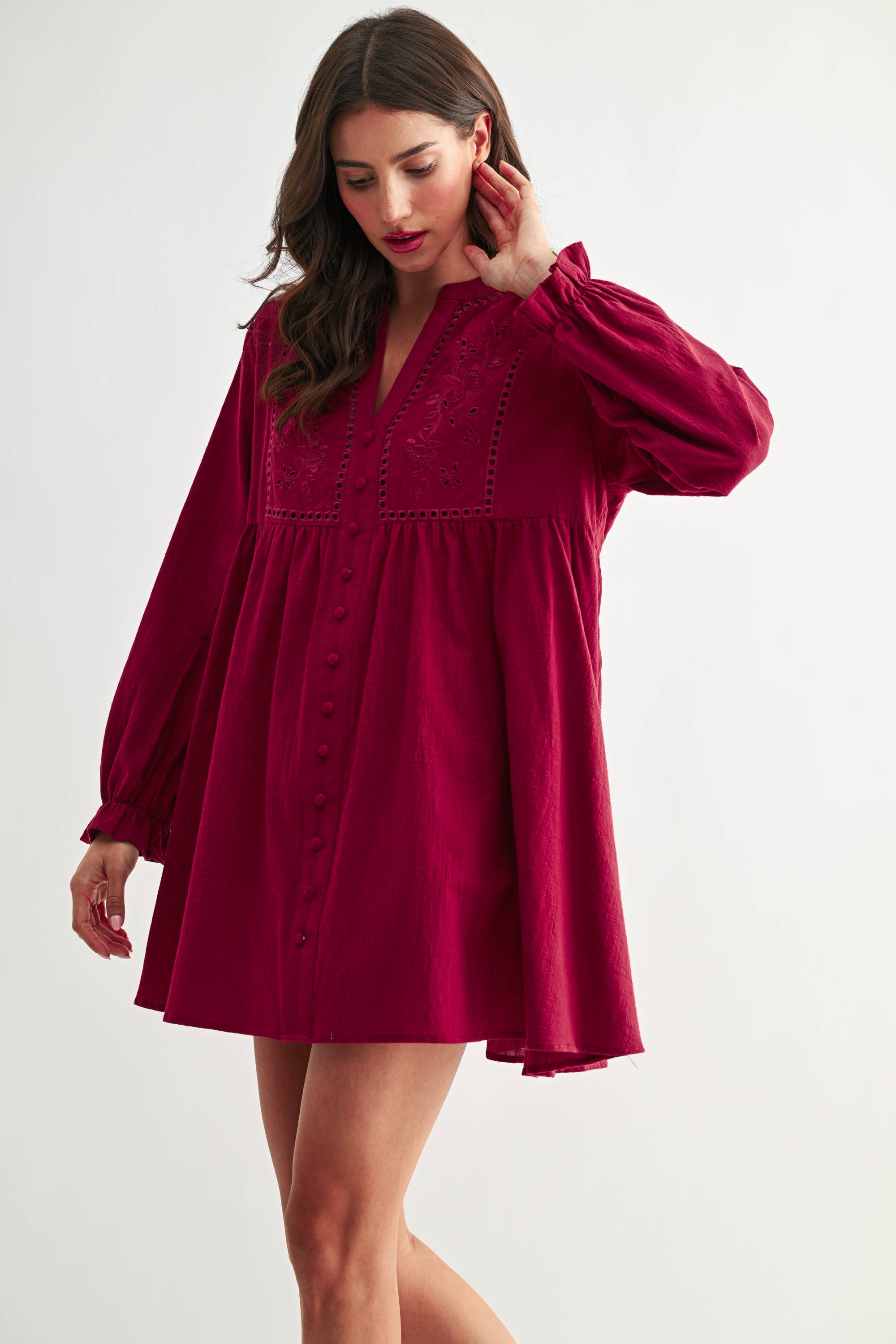 SKU: F23003MINGRECIA XL Made in India Aesthetic: Bohemian and Casual Care Instructions: Dry clean only Color: Red and White Dress Style: A-line and Baby Doll Embellishment: Embroidered Fabric: 100% Cotton Fit: Contemporary and Missy Neckline: Collared Occasion: Everyday and Resort / Vacation Pattern: Solid Season: Resort Skirt & Dress Length: Mini Sleeve Length: Long Sleeve Weight: 181.44 g (6.4 oz)