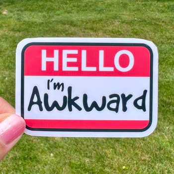 This very playful take on a Name Tag Sticker. It is vinyl, so it is water proof and long lasting. Awkward is also stands out because it is purple glitter.