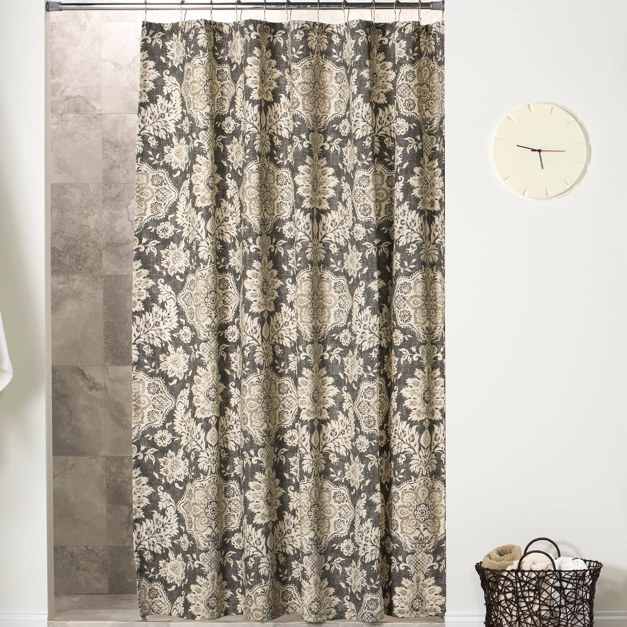 Size: 71" x 71". 100% Polyester. Machine Wash Cold. 12 Plastic Shower Hooks included. Reinforced Top-Header with Rustproof Grommets. Water Repellent.