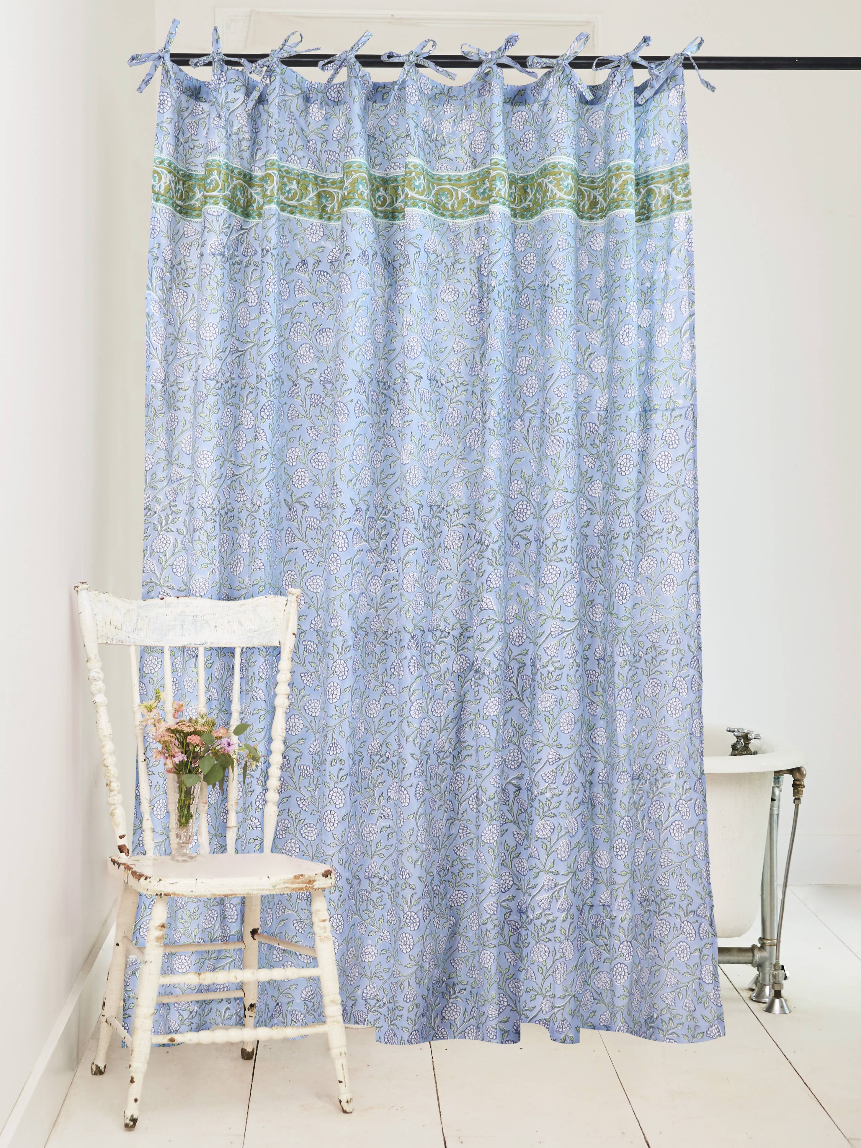 We love traveling and around the corner of every place are hidden shapes and lines that lead us to create. This Circle and diamond design is inspired by a door from the Grecian islands. The print went through a multiple printing process. Starting with printing a mud resist for the big circle, then dyeing it in light indigo, and then printing mud resist again for the diamond shape, then dyeing it again in dark indigo to create the multiple color dazzle! hand printed using carved wooden blocks dyed in natural dyes color - dark and light indigo 100% medium weight cotton 3 inch open rod pocket + backtabs includes 1 panel