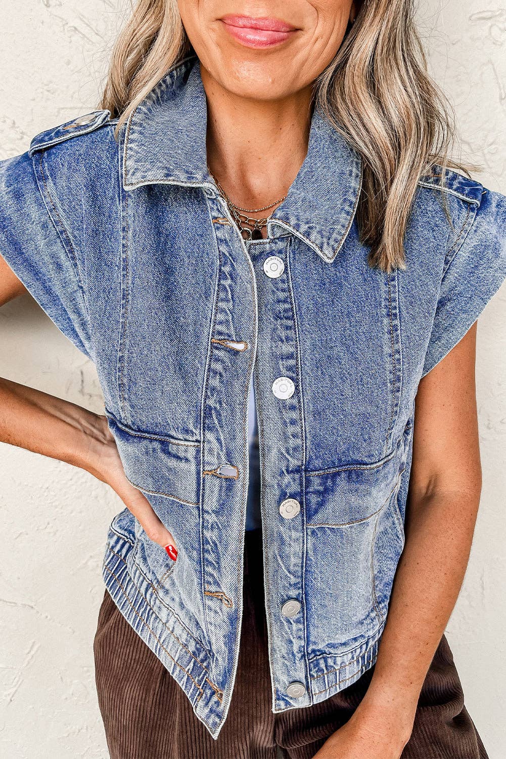 Button-Down Sleeveless Round Neck Waistcoat Vest A solid-colored, round-neck sleeveless waistcoat vest top featuring a button-down front closure. Designed with a regular-length fit, this top has a split hem at the front, adding a stylish touch to its sleek silhouette. MT1661 Buttoned vest, tailored vest, womens clothing, work wear, trendy, solid vest, sleeveless vest, fitted vest, classic, minimalistic, spring, summer, ootd, womens tops, slim fit