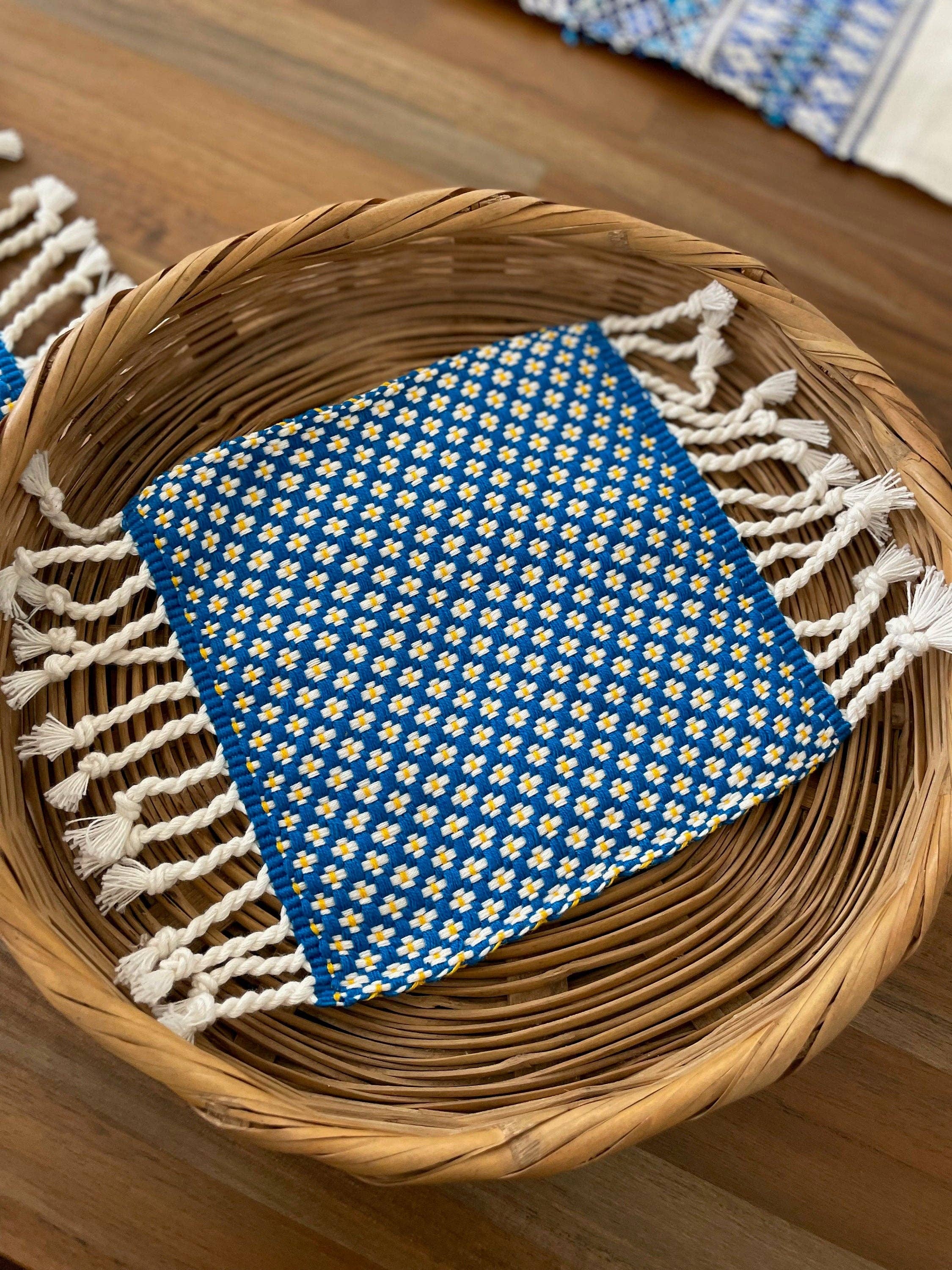 Beautiful Mayan textile tablecloth napkins. Handwoven by local artisans in Guatemala. Can be used as tableware napkin, bread cloth, tortilla warmer, placemat and accent pieces. Featuring a fringe finish on both ends.  Each piece is handmade featuring a unique design. As a unique handmade product each product may vary. MEASUREMENTS 12x12 Inches (approximately) MATERIAL & CARE Cotton This is machine washable but we recommend hand wash separately with cold water. Do not bleach Hang to dry