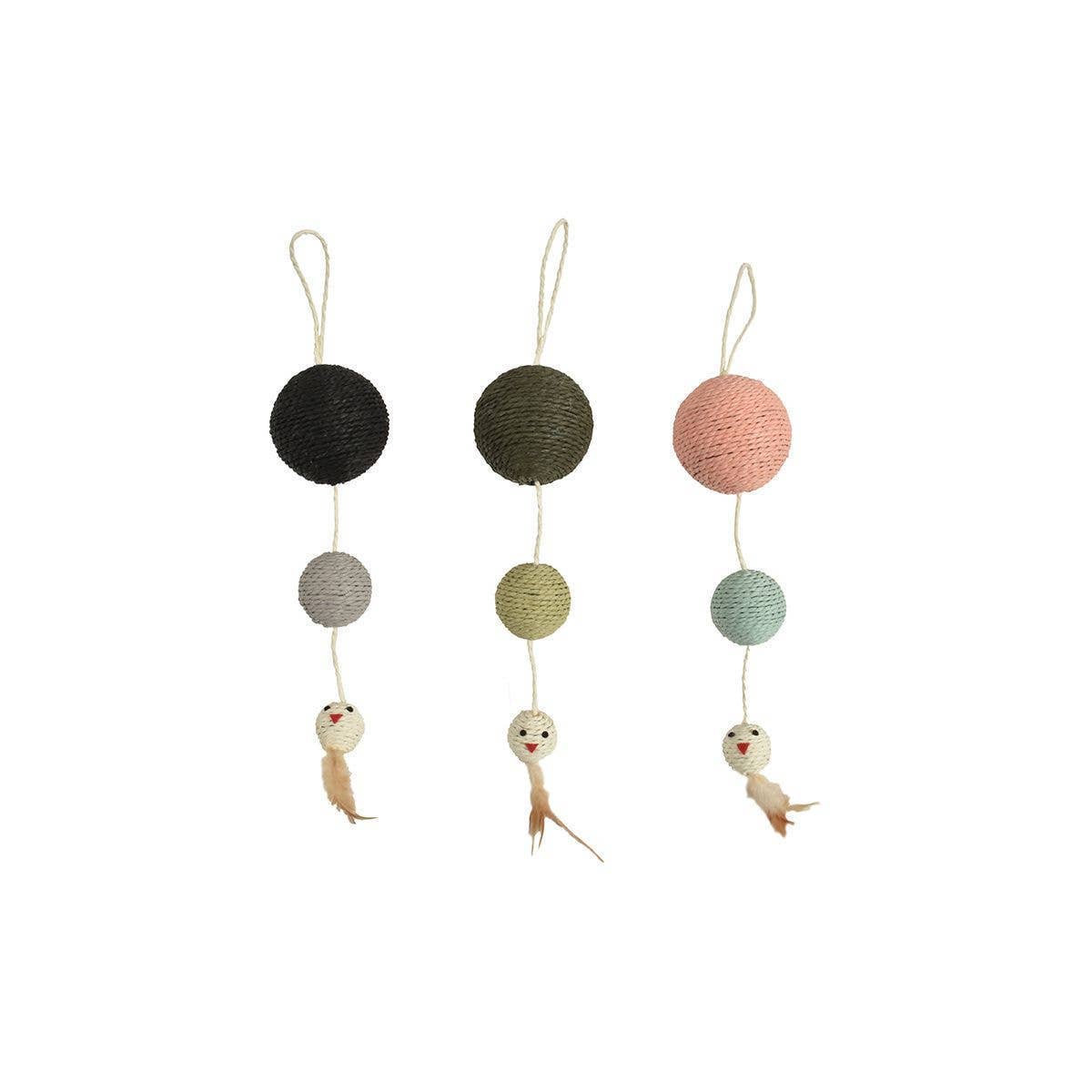 Collection of toys made from recycled paper rope in pastel colors. These scratching posts are ideal for daily claw maintenance. Equipped with feathers and balls, they will encourage the cat to play and exercise. They are easy to hang. No more claw marks on the sofa! Composition: 100% paper rope and natural dyes Dimensions: LxWxH: 21 x 12 x 14 cm Product benefits: - recycled paper rope - stimulates the cat's hunting instinct - natural feathers