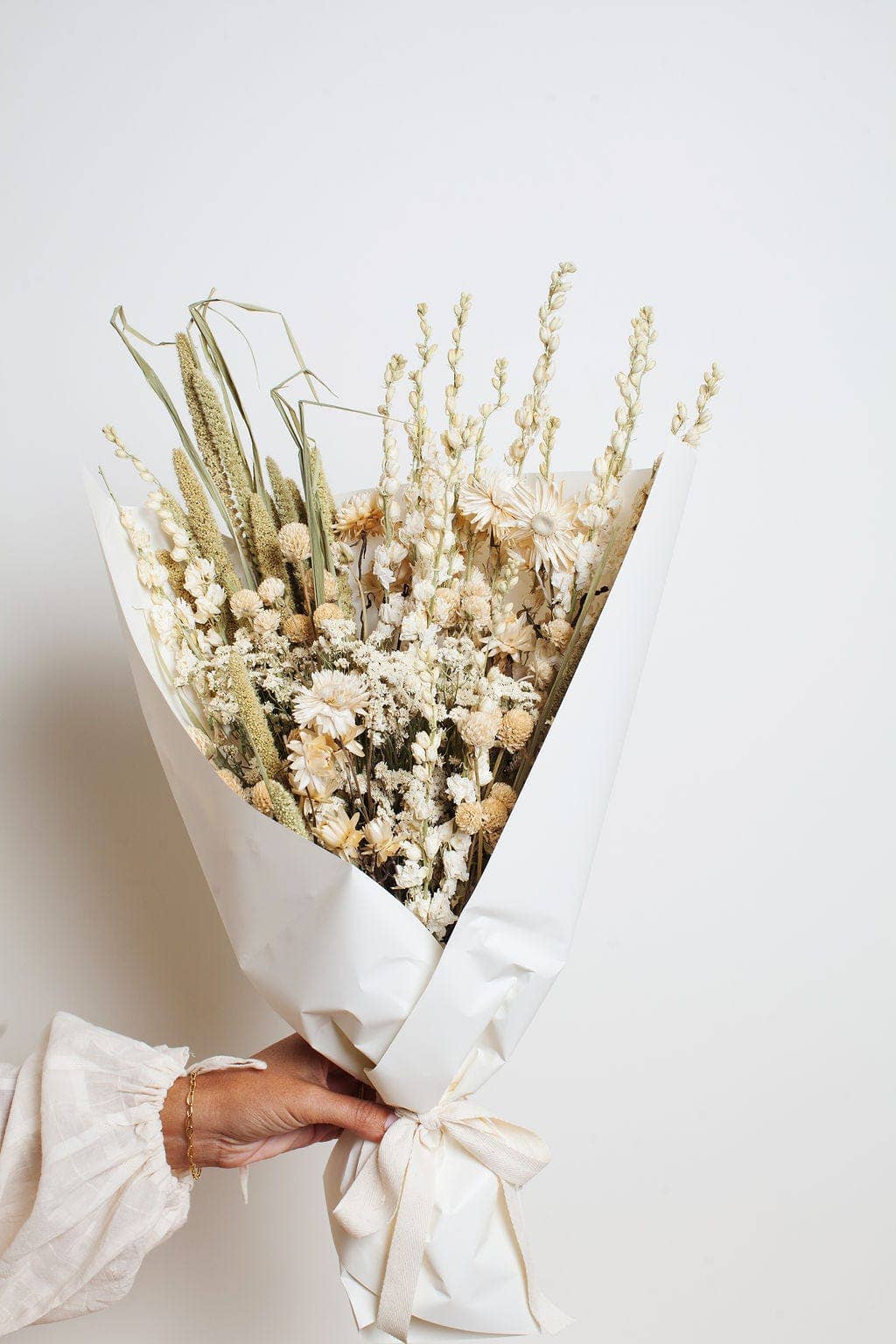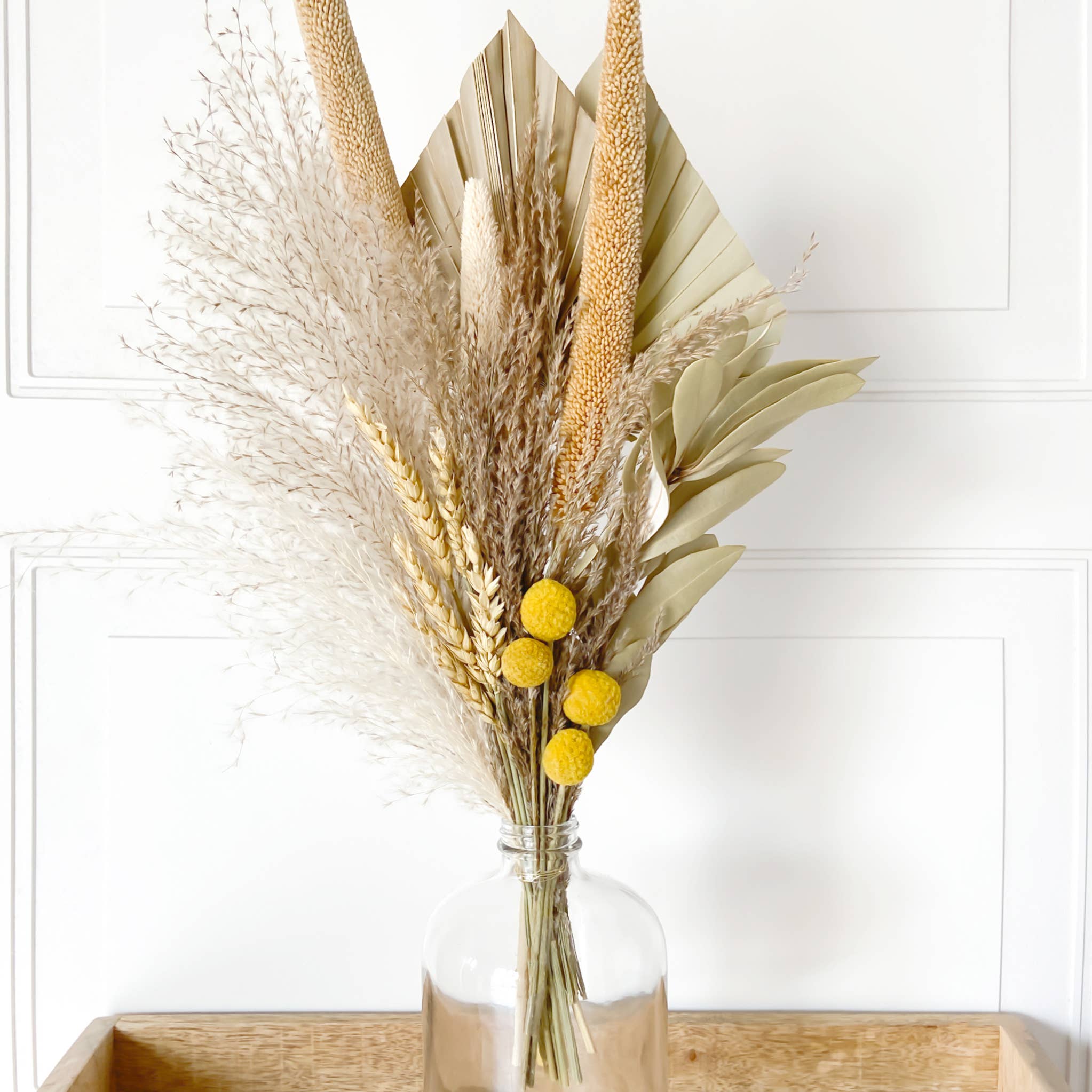 Dried Flower Bouquets have become a staple in home décor. They add a beautiful touch to any space that can be enjoyed for a very long time as they are long lasting and low maintenance. They are great to be used to make decorative wreaths or as tabletop décor at home by putting them in trendy vases. They are also great as wedding décor and can also be used as gifts to loved ones. They also make great cake toppers to elevate your cake design for any occasion. The dried flower bouquet are made using an assortment of dried pampas grass, flowers, bunny tails, palm spears, ruscus etc. The Bouquet can be purchased on its own or with the vase. In addition, the vase can also be purchased on its own with no bouquet. The bouquet alone measures approximately 17 inches in length. As this product is handmade, please allow minor variations.