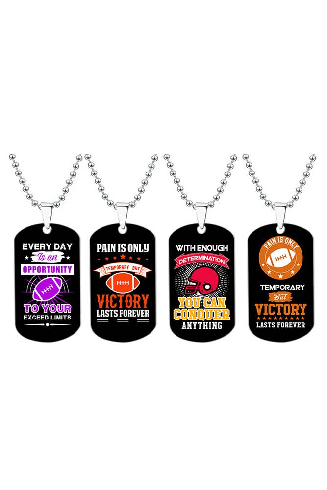 Football sports necklace for guys features a 1" stainless steel round pendant with football design on front that is created with a combination of polished and matte finishes. The stainless steel cable chain is 24". Comes on a bookmark style header card with "Play Hard Pray Harder" on front and 2 Chronicles 15:7 on back: "But as for you, be strong and do not give up, for your work will be rewarded." There are also To and From spaces.