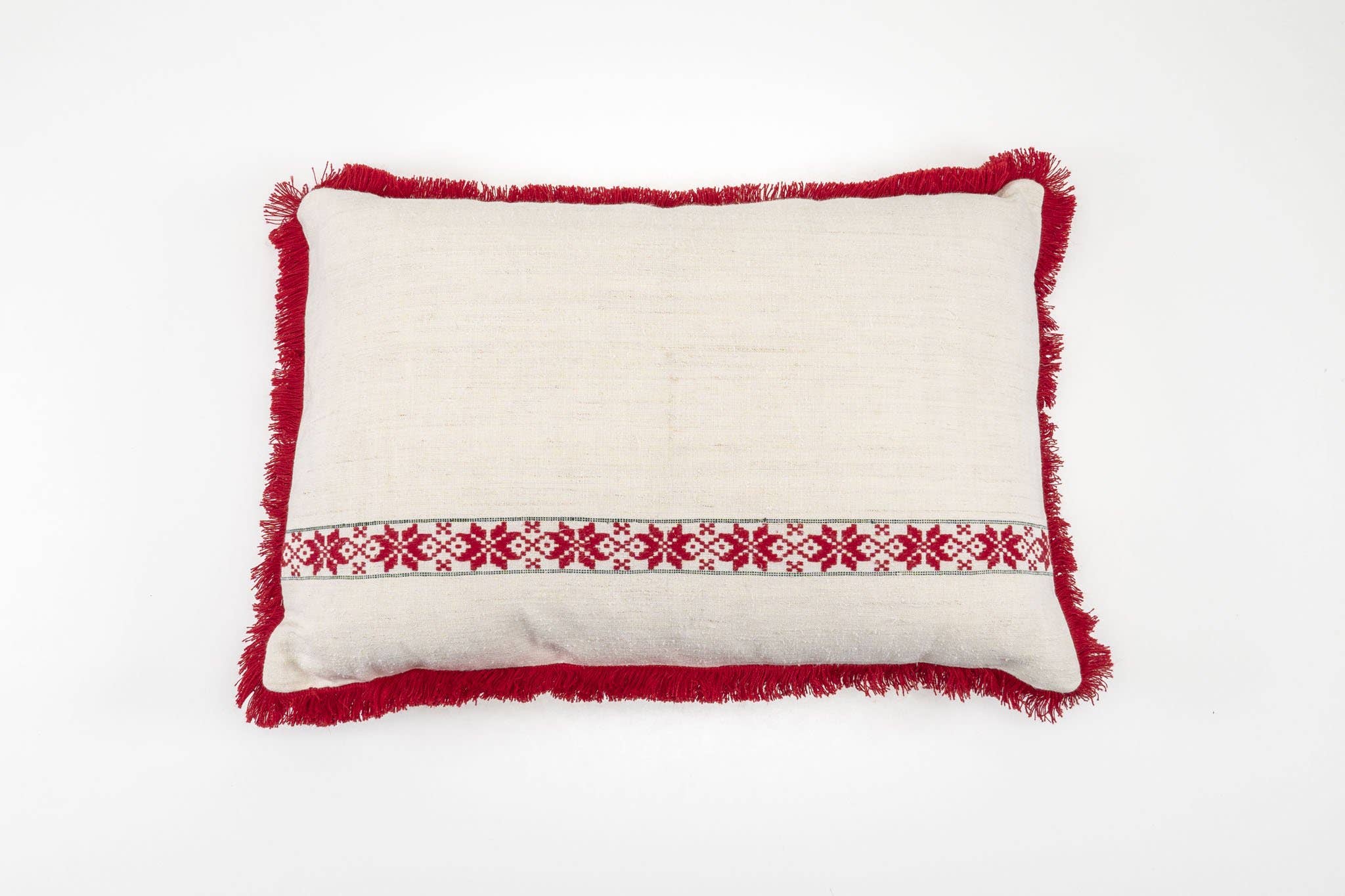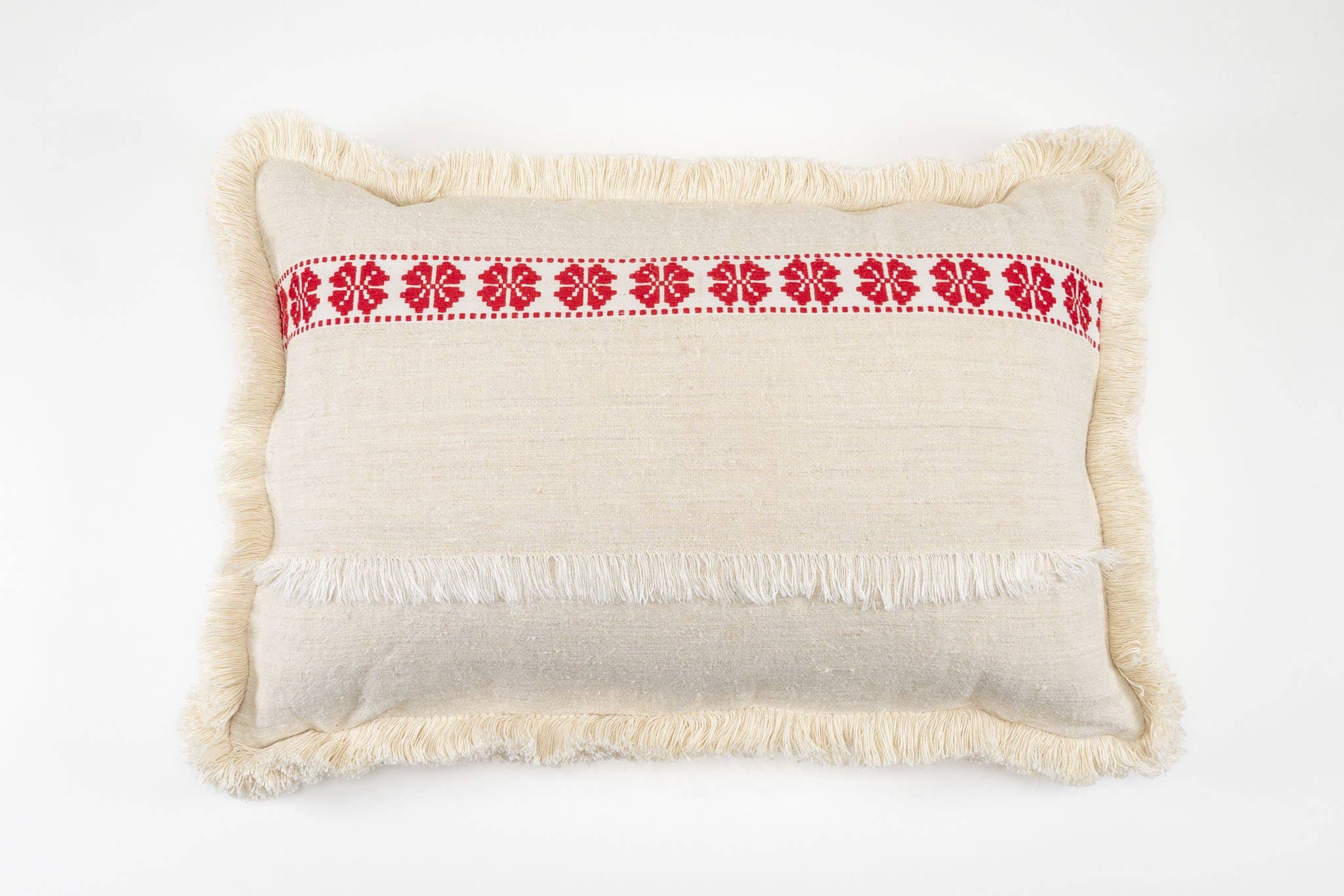 A limited series of three. Hand spun and handwoven hemp, made from a precious antique textile. Soft red back with thickĀ cotton fringe. Made in Hungary. Assembled and sewn by Julia. Custom recycled down insert from Hungary. Our products are all artisan made, re-crafted, restored, and or mended. Some are irregular, some are stitched and others are just perfect the way they came. Be prepared to be surprised as they are all unique and lovely.Ā Each piece comes with a lavender sachet, and hemp cloth patch in a custom made reusable organic cotton bag. Mending your keepsakes allows for less waste.Ā
