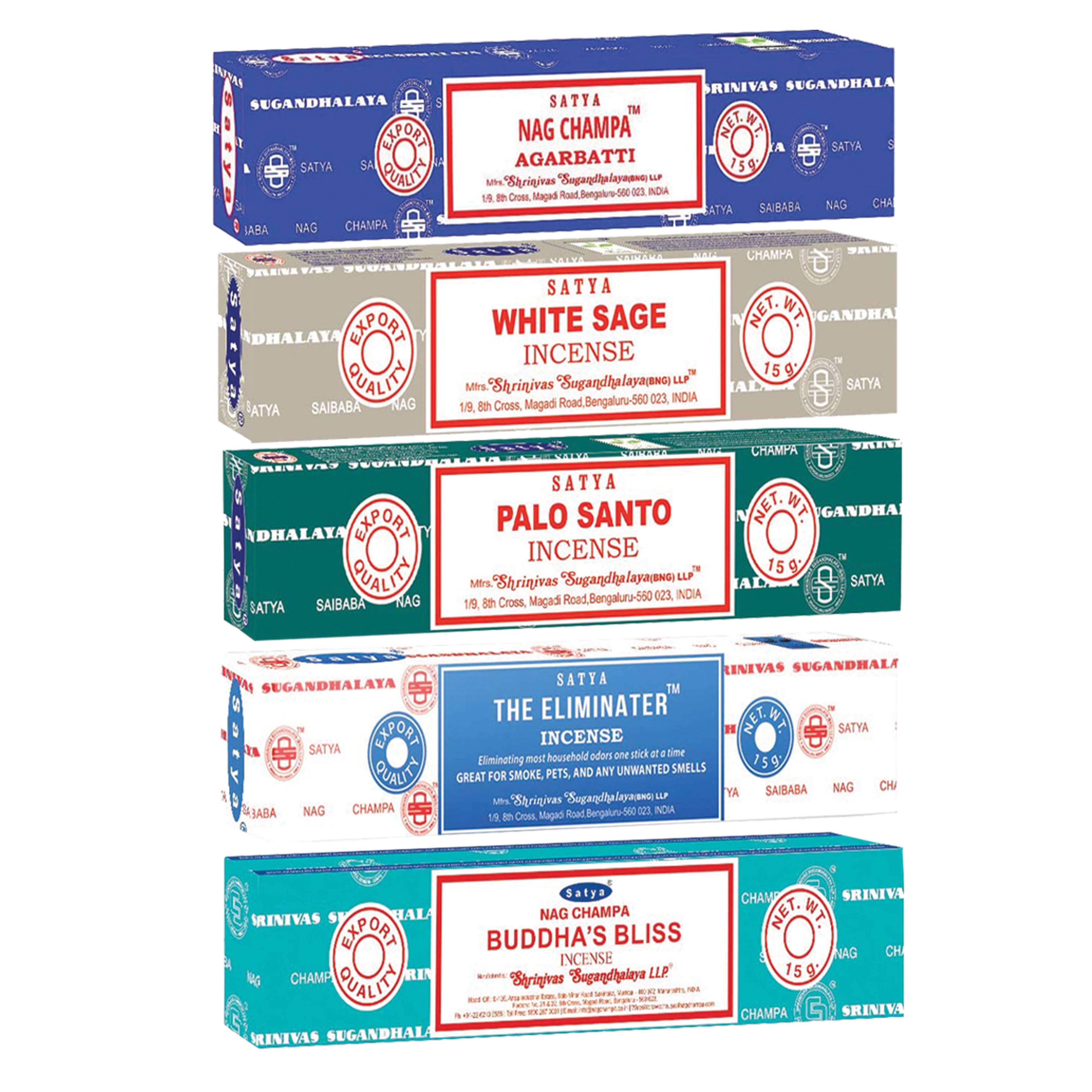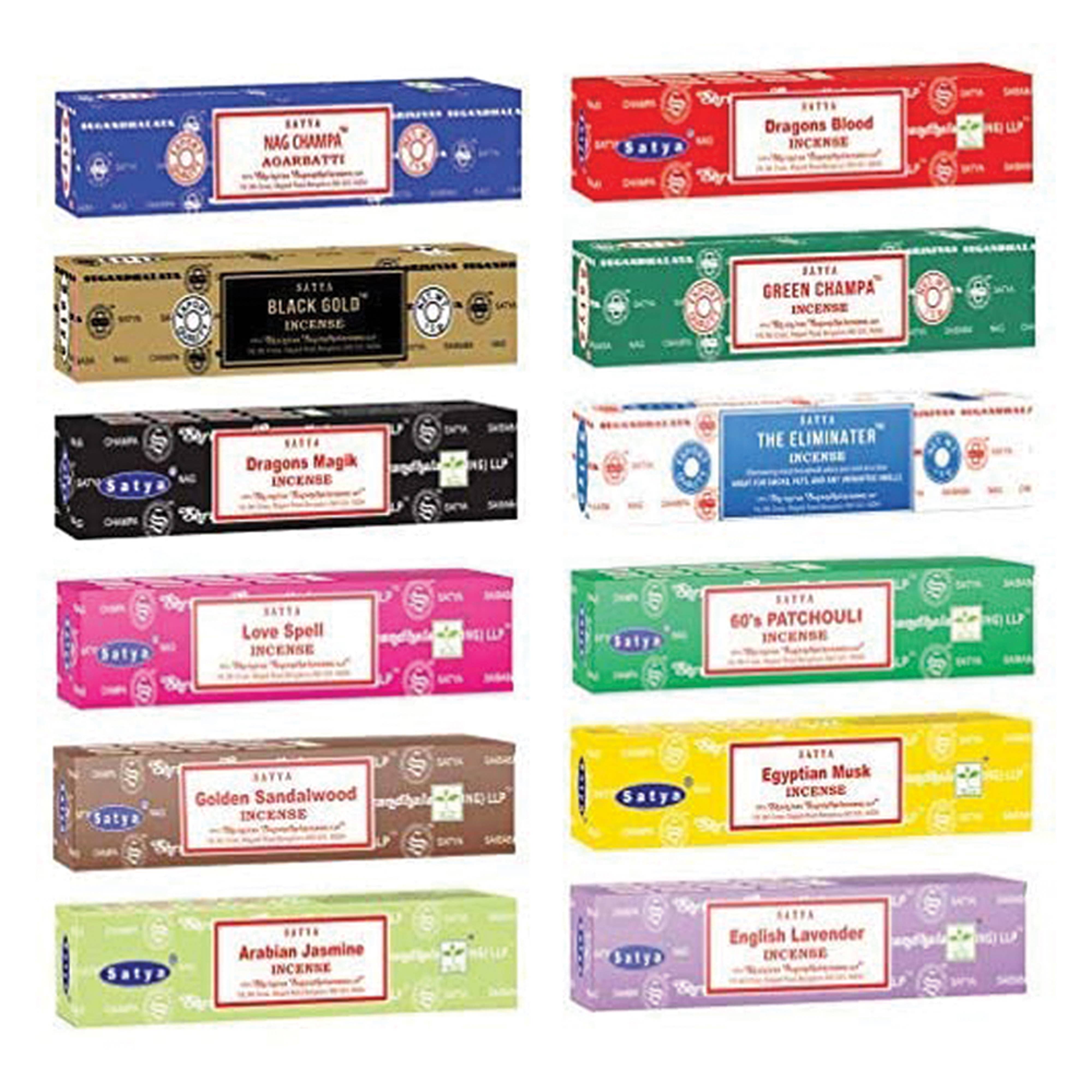 (Satya) Nag Champa Variety Pack 1 15 g./Pack, 12 Pack/Assortment Fragrances Include: - Nag Champa - Black Gold - Dragon's Magik - Love Spell - Golden Sandalwood - Arabian Jasmine - Dragon's Blood - Attract Money - The Eliminator - 60's Patchouli - Egyptian Musk - English Lavender EVOKES POSITIVITY: These incense sticks will diffuse relaxing aroma that would purify any area by eliminating negative energies and evoking positive vibes, making them suitable for any home or office area. Welcomes Good Fortune, Love, and Creativity: The fragrance is said to create a tranquil environment that welcomes love, creativity and good fortune, making it a great fit for both home and office environment. LONG BURNING: The traditional method of preparation of these Agarbattis makes them unique and they burn longer as compared to other incense sticks.