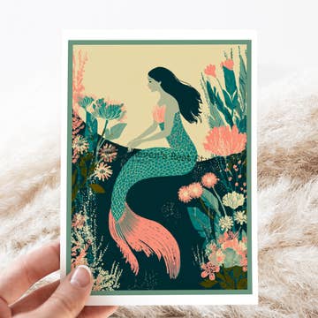 A hand-painted card featuring mermaids swirling in a kelp and seaweed forest. Fun, charming, and sweet! Crafted with care on 100% Post-Consumer Waste, FSC-certified stock in a solar/wind-powered facility, and printed with vegetable and algae inks, our cards are an earth-friendly choice for retailers. Each card features a blank interior and includes a Kraft envelope, providing a lovely canvas for your customers' good wishes, thoughtful notes, and sweet sentiments. Details: - A2 (4.25” x 5.5”) - Kraft envelope included - Blank inside - Printed with vegetable and algae inks - Produced locally in a solar/wind powered facility - Printed on 100% Post-Consumer Waste, FSC-certified stock