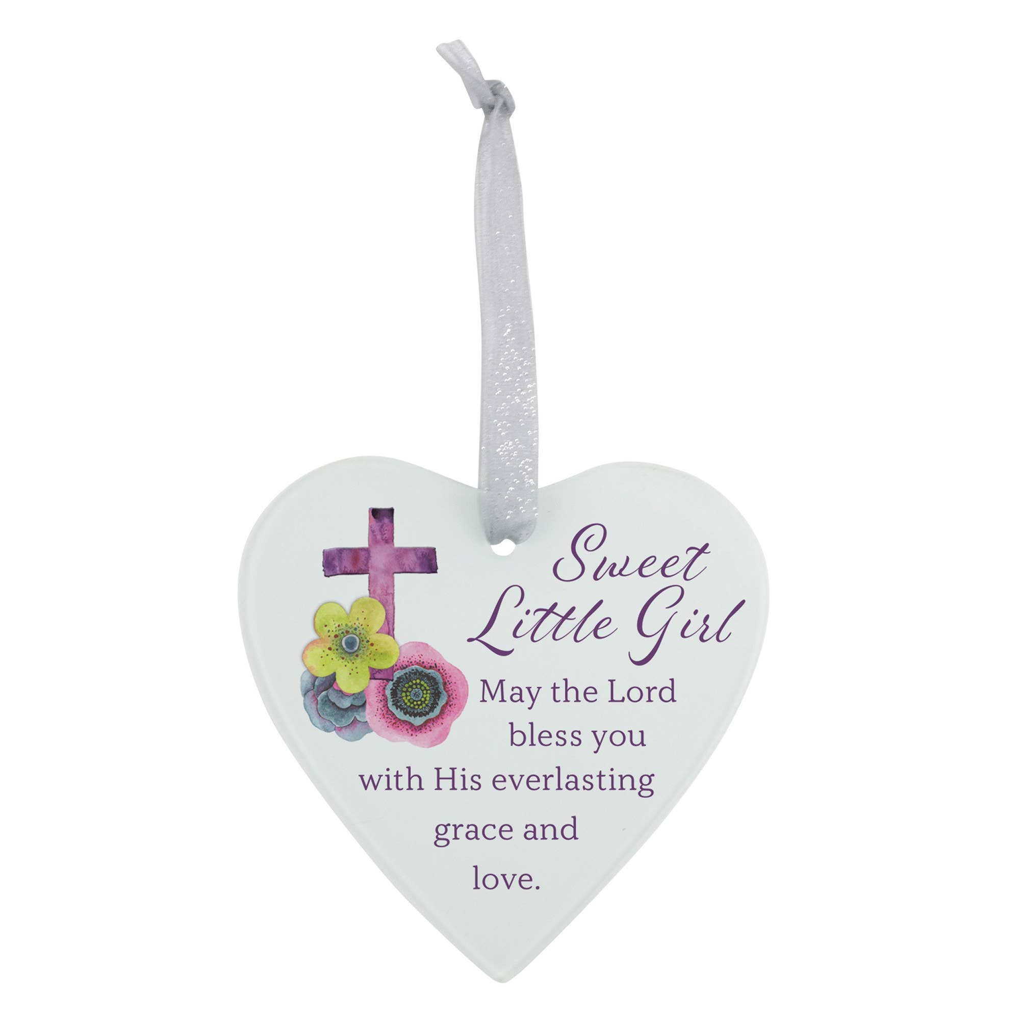Rocking horse crib medal in silver enamel finish with sparkling pink epoxy & soft pink ribbon. Etched prayer for protection. Carded.