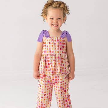 Meet your new favorite soft and comfy two-piece set that is made for fun and play! Featuring a ribbed cotton tank and wide-leg pants, the Flower Child Tank Set offers an easy, breathable fit adaptable through the spring to summer season. * Features adorable curled lettuce hem on the bottom of the tank and pants * Soft and stretchy ribbed cotton with a stretchy waist band for easy wear * Adorable to match with the Flower Child Onesie Set * 75% cotton, 20% poly, 5% spandex * Recommend sizing up if putting in the dryer as high cotton content has tendency to shrink