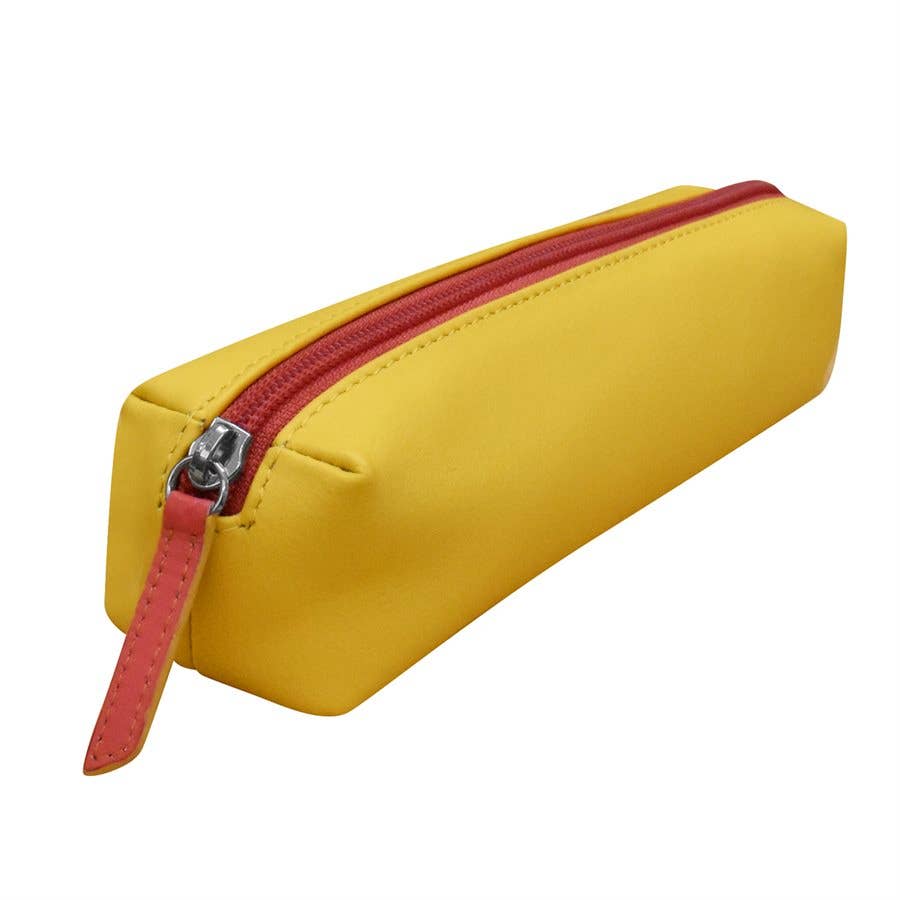 This luxe pencil bag reveals a loving and inspirational message when opened. Durable and designed for everyday use. Measures: 9 x 3 x 2 inches. Soft vegan leather alternative. Premium cotton lining. Preset message in black font. Durable YKK zipper. Lightly padded structure. Double-stitched pressure points. Care: spot clean is ideal. Machine wash cold delicate. Air dry. Exterior Color: Mustard. Lining Color: Select from chart