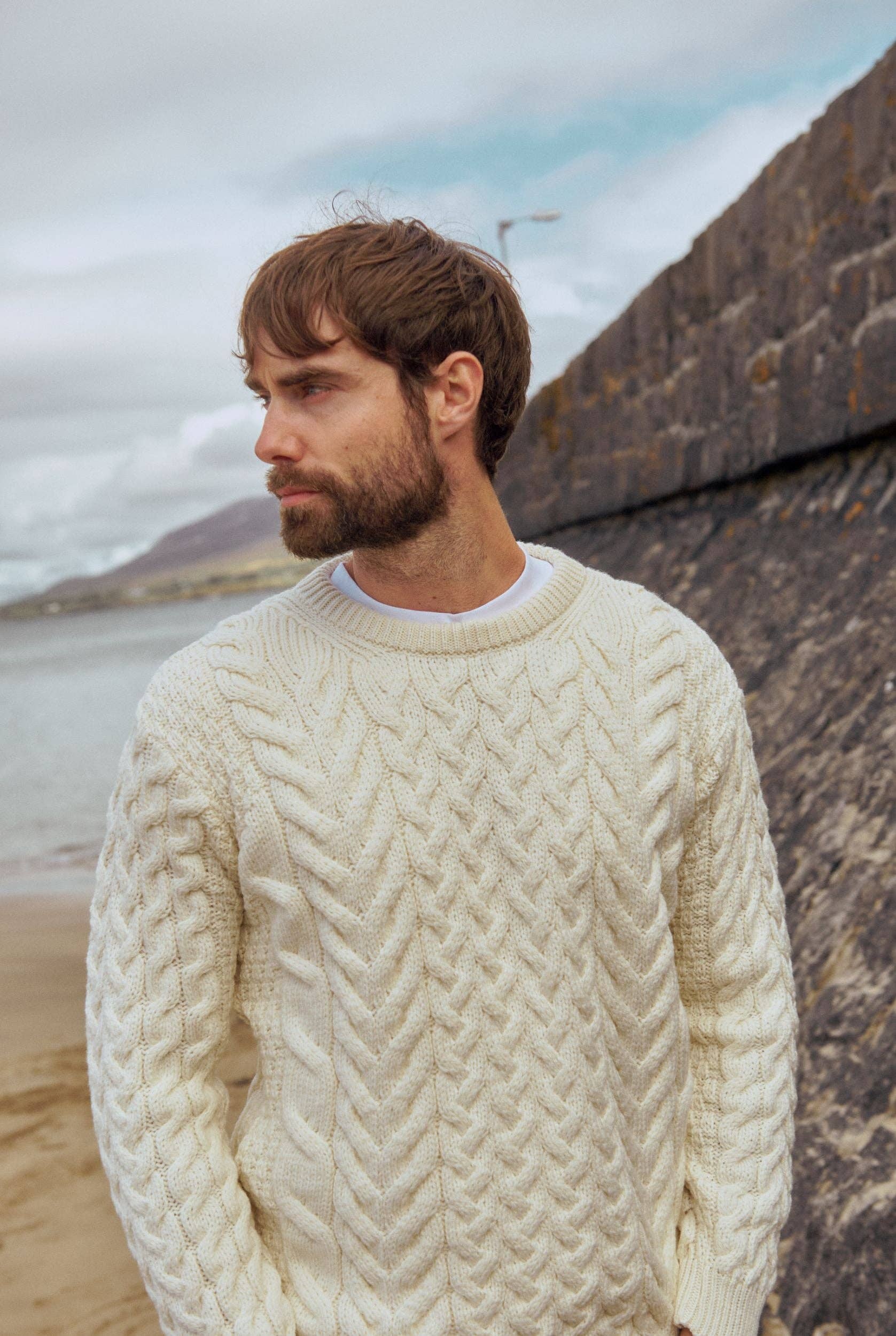 Named Éireann, after the landscape and country that inspired its creation. The Éireann is the quintessential Aran sweater, for him and for her. A proud member of the Supersoft Collection, this piece balances Irish Authenticity with modern comfort, uncompromising in quality and heart. With a stunning combination of traditional Aran stitches such as honeycomb, moss and cable, this piece holds the power of Ireland’s rich history while simultaneously standing tall as a contemporary, versatile addition to your wardrobe. If you’re in search of Ireland’s authentic spirit, you’ve found it.