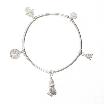 • Silver plated adjustable bangle bracelet for kids • Size 2in - 2.5in adjustable • Comes with all the charms shown in image • Individually packaged • Assembled in the USA with imported parts • Free display tray available upon request with order of 24+ necklaces/bracelets