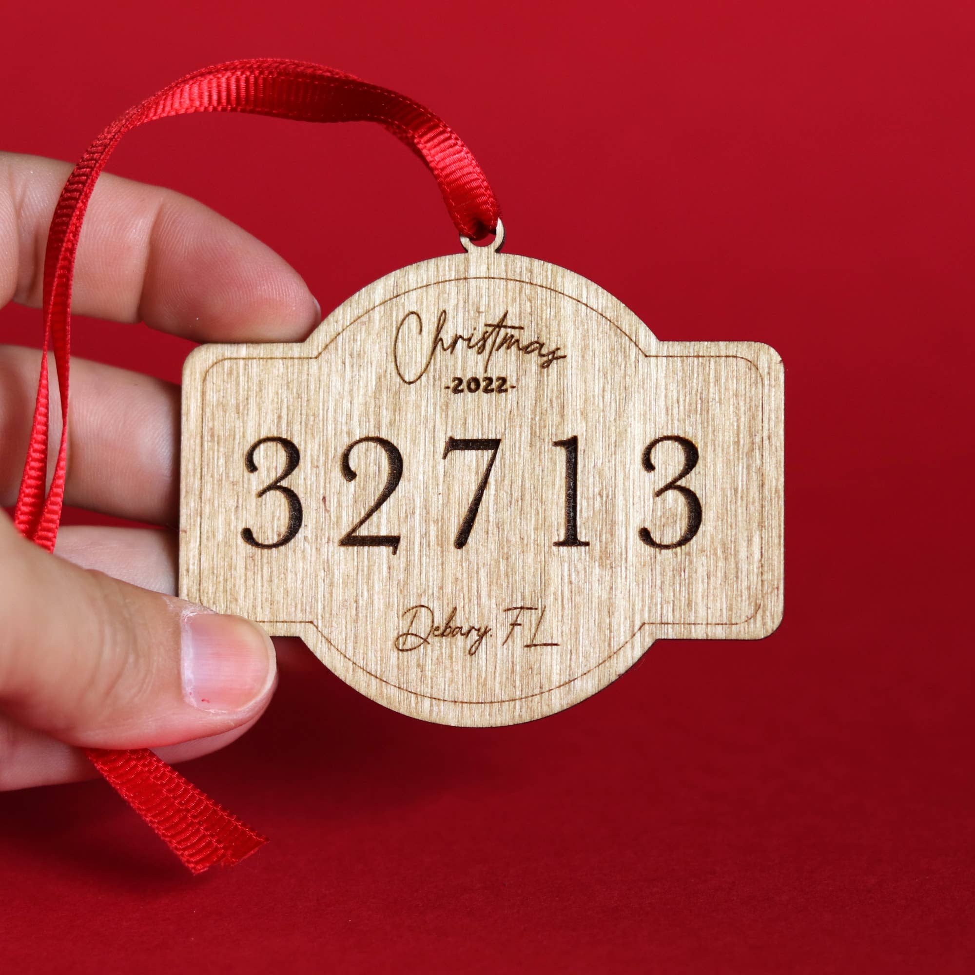 The zip code ornament is personalized with the zip code and city of your choice. Made of red 1/8" acrylic, engraved and paint filled. On a leather hanger with a wooden round bead. The ornament measures 3.25" x 2.75" Top will say 'Christmas 2024' with your zipcode, city and state.