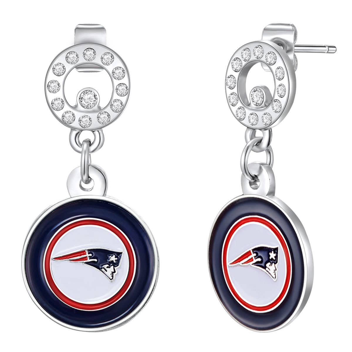 These Rhinestone Dangle Earrings are a glamorous addition to any game day outfit! Adorned with shimmering rhinestones and featuring a team-colored logo in the center, they add a touch of sparkle and team spirit to your look. The fish hook backings make them effortless to put on, ensuring you can wear them with ease as you cheer on your favorite team. Being officially licensed, you can flaunt your support for your team with confidence and style!