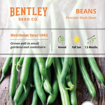 An easy, productive green bean seed choice for your garden! Provider Bush Beans are wonderful space-savers, making them perfect for smaller gardens or container gardening. Packet Size: 3 ¼" x 4 ½" Growing Instructions: * Plant Provider Bush Bean seeds about 1 inch deep and 2 inches apart, after the danger of frost has passed. * They can be planted in rows or sections 3 feet apart. * No trellis is needed as Provider Bush Beans grow low to the ground in a compact bush. * These beans are a very prolific producer. * We also offer bulk green bean seeds. Seed Information: * Lifecycle: Annual (vegetable) * Time to Maturity: About 1.5 months * Sun Requirement: Full sun * Spacing: 2" apart * Planting Depth: 1 inch * Seeds Per Packet: 20-30 * Seeds Per Ounce: 100 * Ideal Germination Temperature: 75°F * Sowing Method: Direct sow Uses: * Great for canning, freezing, and eating fresh, allowing you to enjoy the multiple health benefits of beans during the growing season and beyond! Additional Information: * Heirloom Year: 1965 * Plant Scientific Name: Phaseolus vulgaris Online resale prohibited.