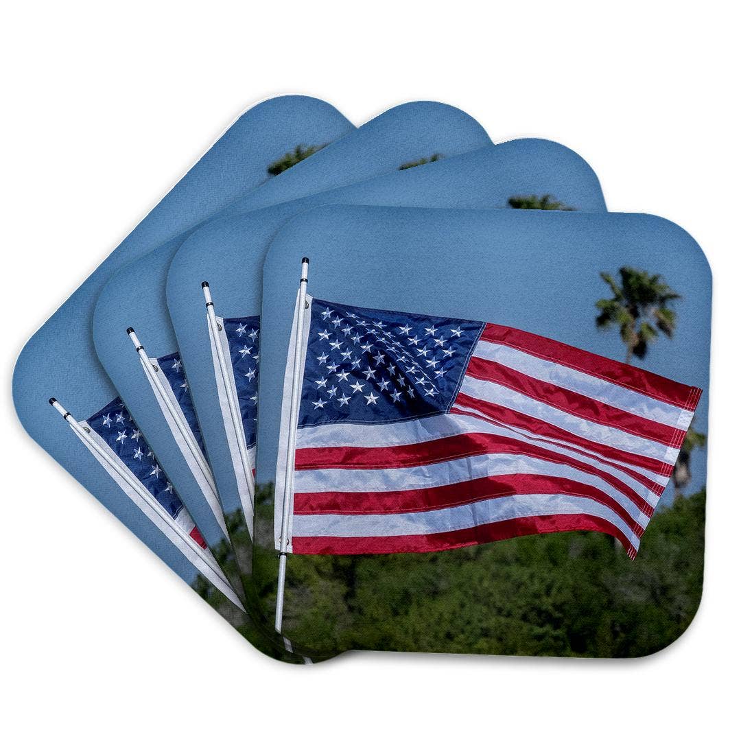 Show your patriotism with these wonderful american flag beach tote coasters. These coasters have been lovingly stamped, painted and sealed so they are waterproof. The coasters are 4" x 4" and also feature a full cork backing for furniture protection. 1 unit is 1 coaster