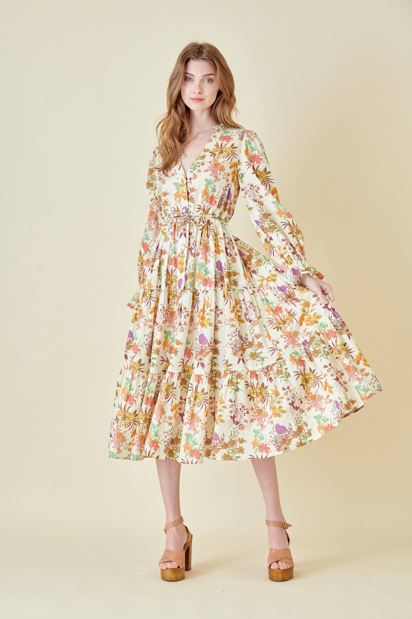 Cotton Floral Print Long Sleeve Tiered Mini Dress - 27837D