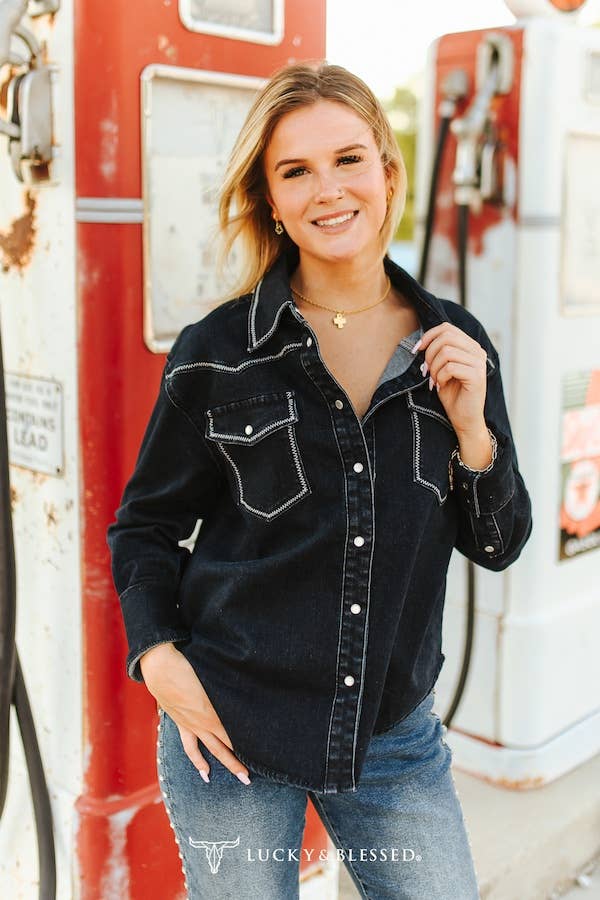 Blue and white floral eyelet western top with piping yoke and trim, body is lined.