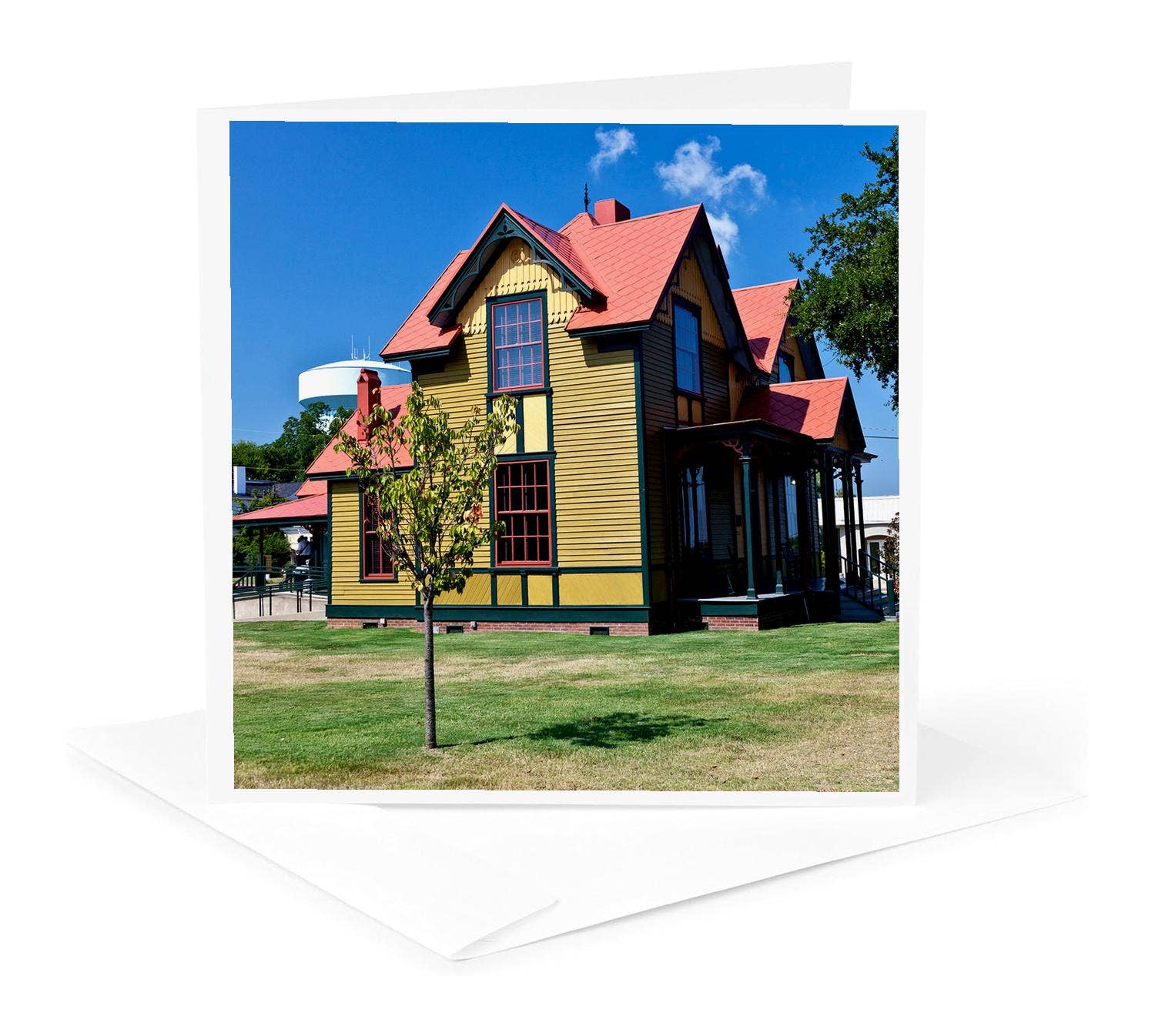 Vibrant rendering of a Martha's Vineyard cottage in Oak Bluffs that will be familiar to anyone who has visited the island. 5 x 7 card with brown craft envelope and gold seal. Card back provides a brief history of The Cottages.