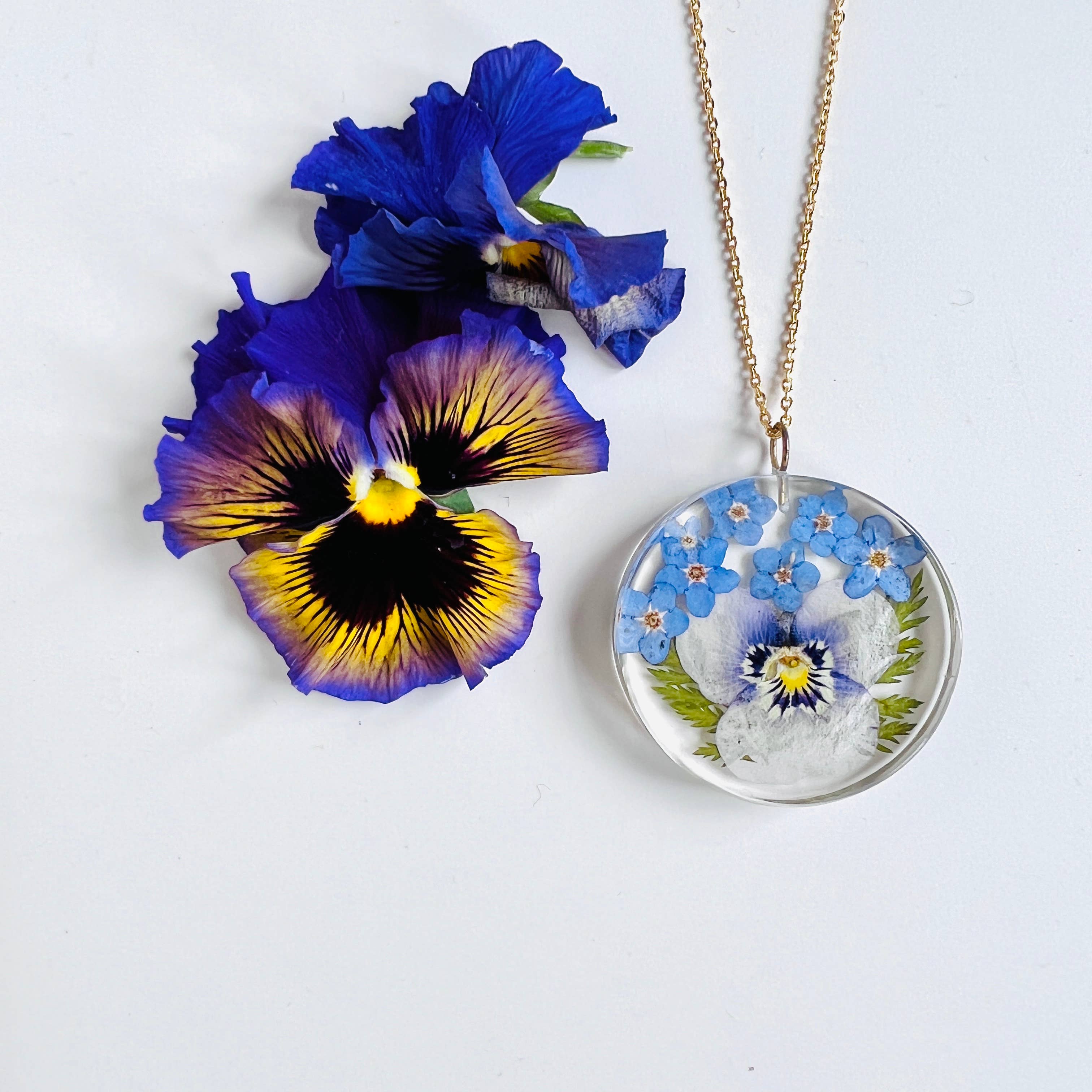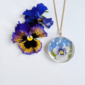 Dried Forget-me-not flowers are preserved in resin. Historically, these flowers symbolize remembrance (not much of a surprise there) not only associated with love, but for those we've lost. Forget-me-nots also symbolize protection and luck, and it's believed that they have the power to protect humans against witches. The pendant is 36 x 23.5 x 4mm. (almost an inch wide and a little more than an inch high) Sterling silver plated, you choose the style of chain.