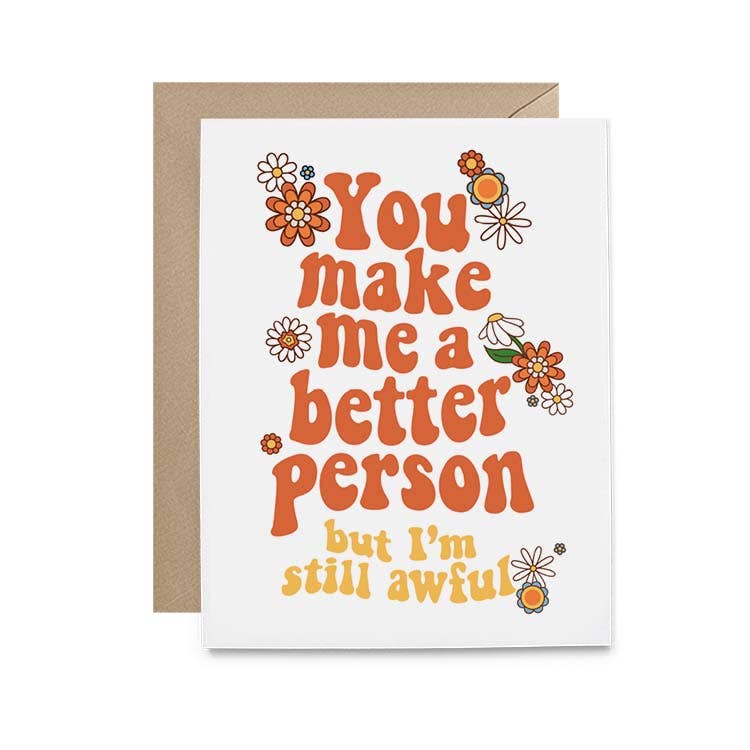 Greeting card with a blank interior. Individually wrapped with a plastic sleeve with a matching envelope. Card measures 4.25 x 5.5.