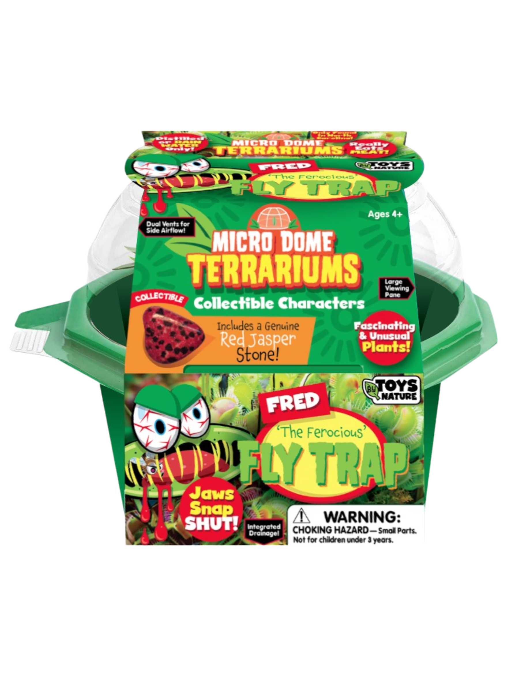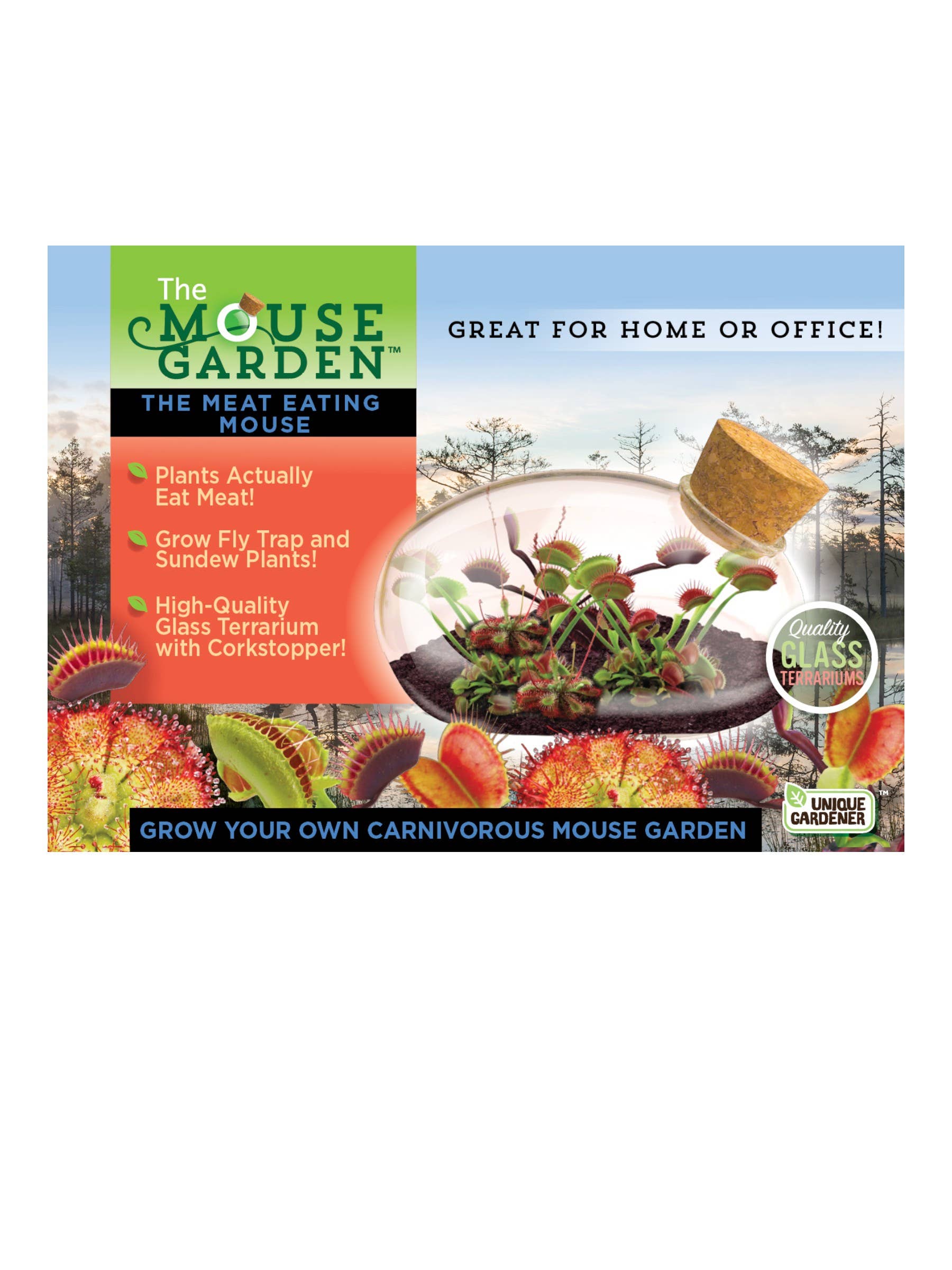 The unique double sphere glass terrarium was designed to give you the best growing experience possible. This custom high-quality glass terrarium was engineered to facilitate side air flow while still maintaining a humid growing area conducive to making plants thrive! Grow infamous Fly Traps surrounded by spectacular meat-eating Sundew Plants! Everything you need is included- just add water! This elegant container with its fierce and striking plants makes a stunning statement anywhere! Contents: Double Sphere Glass Terrarium Pack of Fly Trap Seeds Pack of Sundew Seeds Blue Quartz Stone Compressed Germination Mixture Disk Size Information: Product Package Size: 7.5" x 5.75" x 6.75" Assembled Terrarium Size: 7" x 5.25" x 5" Product Weight: 1 pound Elevated, Décor Forward Product -High-Quality glass terrarium doubles as home décor -Appeals to customers seeking beauty and experience -Fits seamlessly into modern, minimalist, and upscale spaces Strong Gift Appeal -Sophisticated alternative to flowers or candles -Ideal for housewarmings, weddings, anniversaries and holidays -Feels thoughtful, timeless and personal Premium Materials = Premium Perception -Clear, high-quality glass highlights layers of soil, rock and plant growth -Natural elements feel intentional and curated -Higher perceived value with clean, elegant look Low Footprint, High Visual Impact -Compact enough for shelves, desks and countertops -Instantly elevates a display or vignette -Easy to merchandise alongside décor and lifestyle goods Experience-Driven Purchase -Customers aren’t just buying an object, they’re creating a living piece -Encourages emotional connection and long term enjoyment -Less likely to feel disposable and trend based