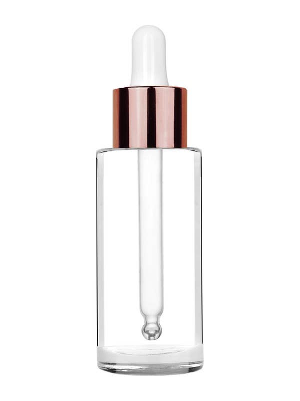Circle 1.7oz clear glass bottle with a white dropper, available in multiple collar cap colors. For use with perfume oils, diffuser oils, serums, primers, facial oils or face oils, moisturizer, and beard oils.