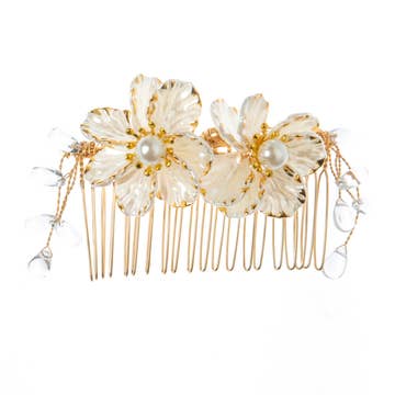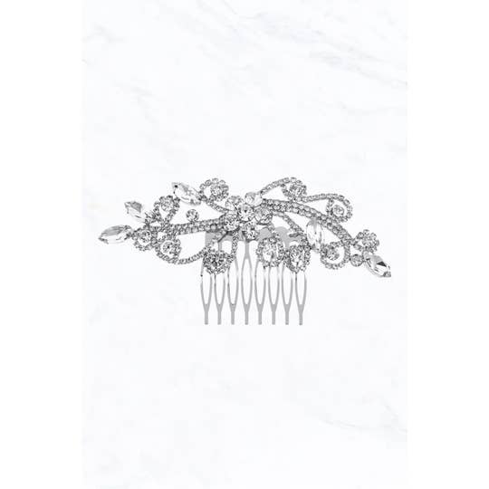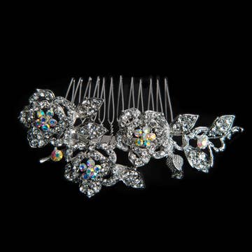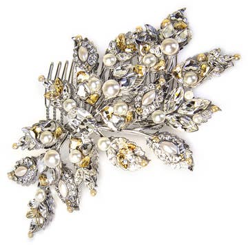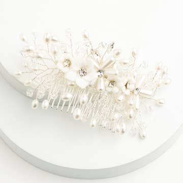 No bridal look is complete without its final touch of glamour! This gorgeous handmade rhinestone, crystal, pearl and beaded hair piece is the perfect addition to your wedding day! The Etta is high quality and handcrafted in a unique white porcelain flower design. It comes on a comb and looks stunning in your hair! This silver hair accessory is a beautiful addition of bling and glamour to your hair on your wedding day! -- Materials: Crystals, Pearls, Rhinestones, Beads, Hair Comb. *Low quantities remaining* -- We are a mother and daughter duo who both have a combined experience of 35+ years in the wedding industry! From bridal alterations, to redesigning vintage dresses from the 60s, to wedding photography - weddings and fashion have always been a huge part of our lives!