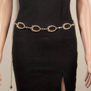Silver Metal Ball Bead Chain and Transparent PVC Belt Featuring Silver Metal and White Pearl Round Buckle. Belt measures 40 inches long when laid flat and 1 inch wide. Belt adjusts from 26 inches to 36 inches. Buckle measures 1.75 inches.