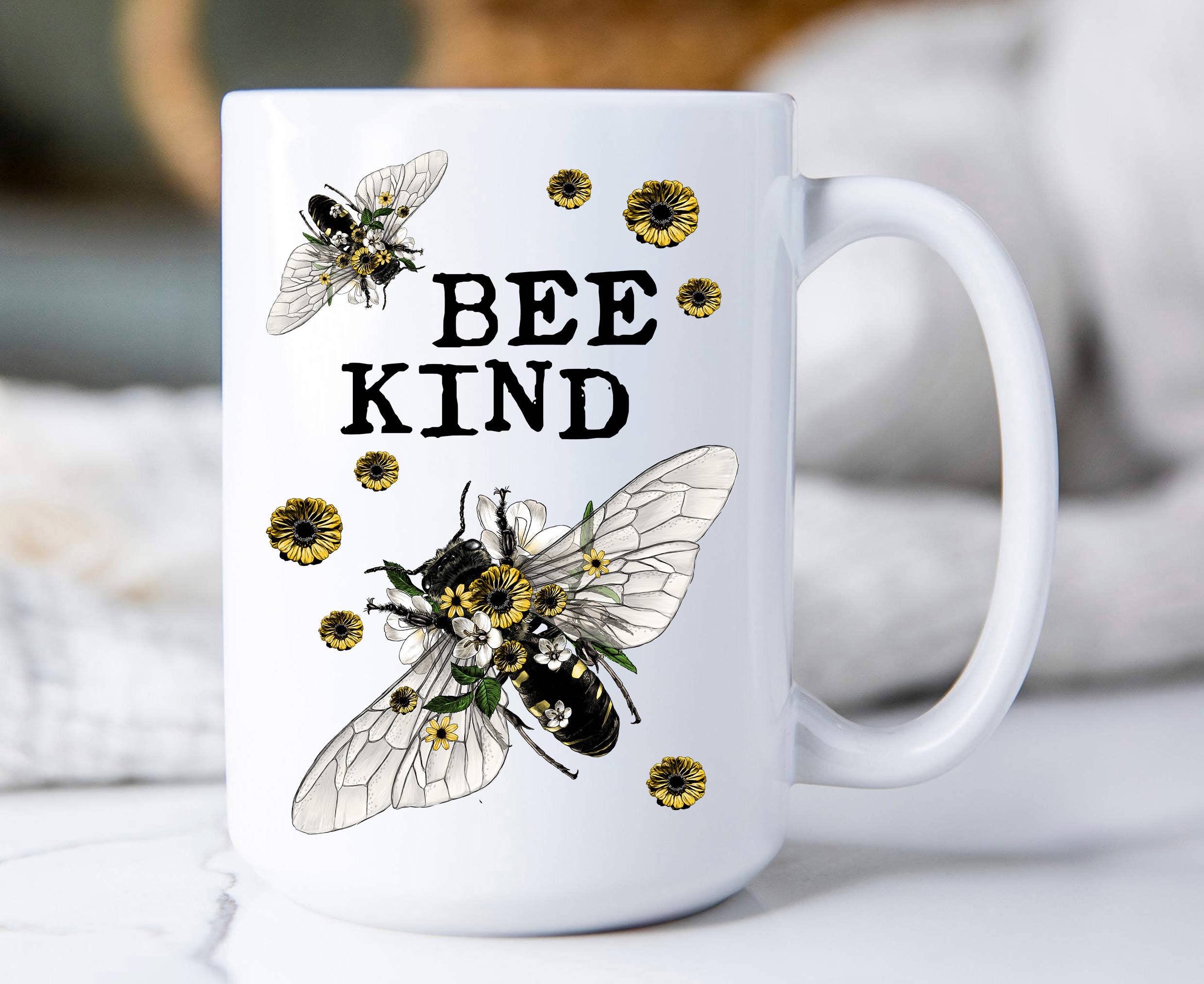 Bee Kind is printed on both sides of our premium quality 11 oz. white mug, scratch resistant. They are made of Ceramic, UV Protected, FDA Compliant, Microwave and Dishwasher Safe.