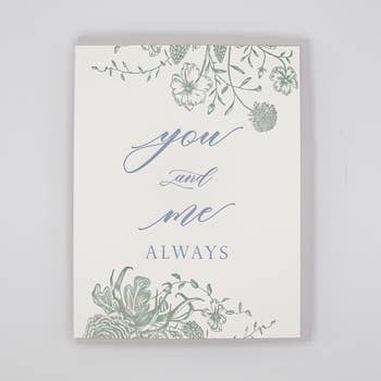 A folded cotton paper with letterpressed A2 card to express how excited you are to spend the rest of your life with your beloved. Perfect card to accompany your proposal, to write on your wedding day, or for everything in between. Come with the A2 matching gray envelopes. Price for each card. Size of the folded card is 4.25"x5.5".