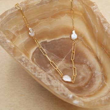 Paper-clip style necklaces continue to reign supreme in popularity and show no signs of slowing down. We've elevated this one by shortening its length and adding a freshwater pearl pendant front and center. The true beauty of this style lies in its uniqueness; no two are alike, making each one as special as the wearer. Ideal for customers wanting to explore chunkier jewelry styles, it can be worn on its own or paired with similar styles to create a custom layered look. * Keishi Pearl * 14KT Gold Plated Brass * Length: 16" plus 3" extender chain