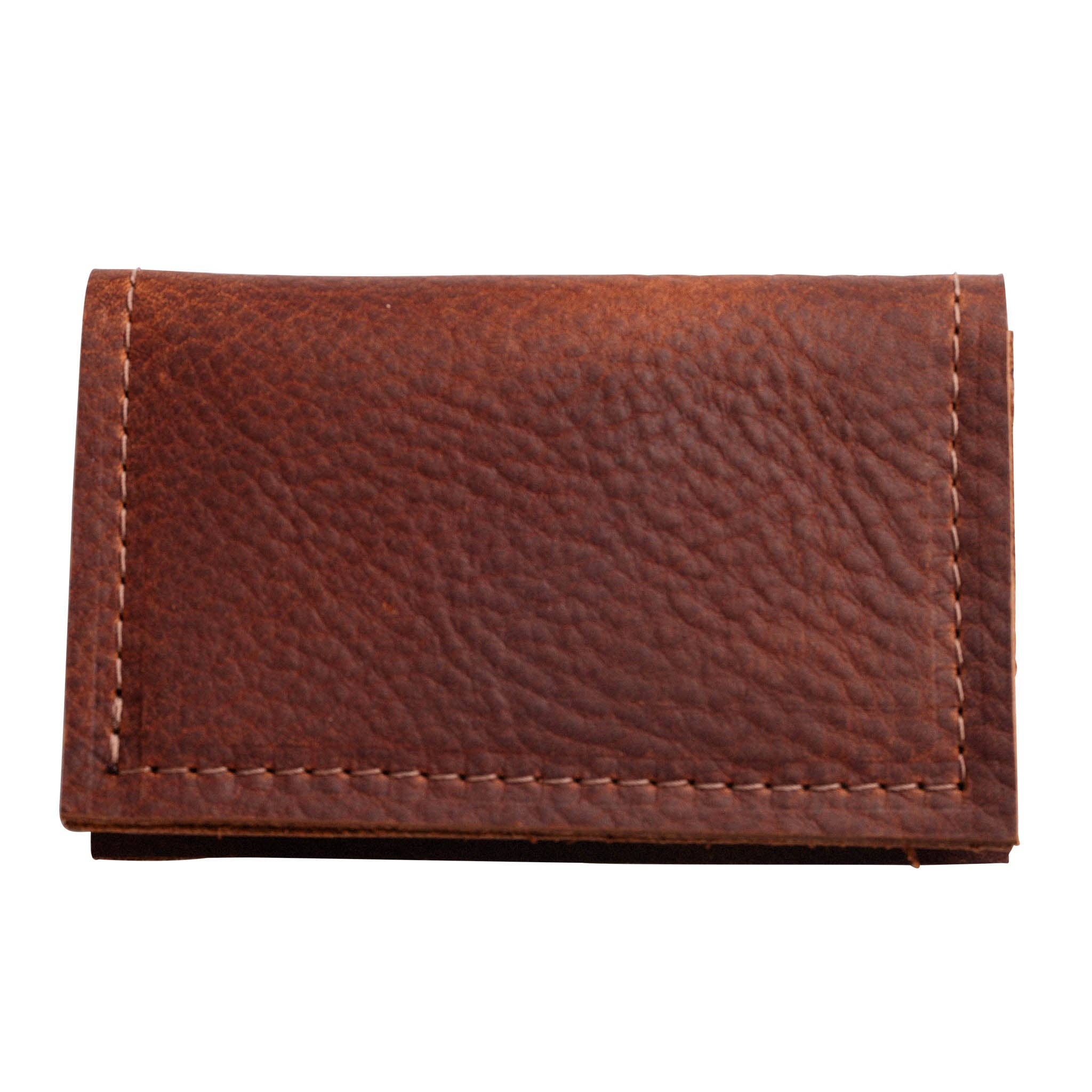 I designed and made this case using reclaimed leather I get from a Maine furniture company. The leather is so soft and supple. I print the graphic that I designed on the leather. The interior has two slots for multiple cards as well as 2 other open slots for more cards or cash. The back has another slot for other cards or stashes. They are approx. 4.5x3 when folded.