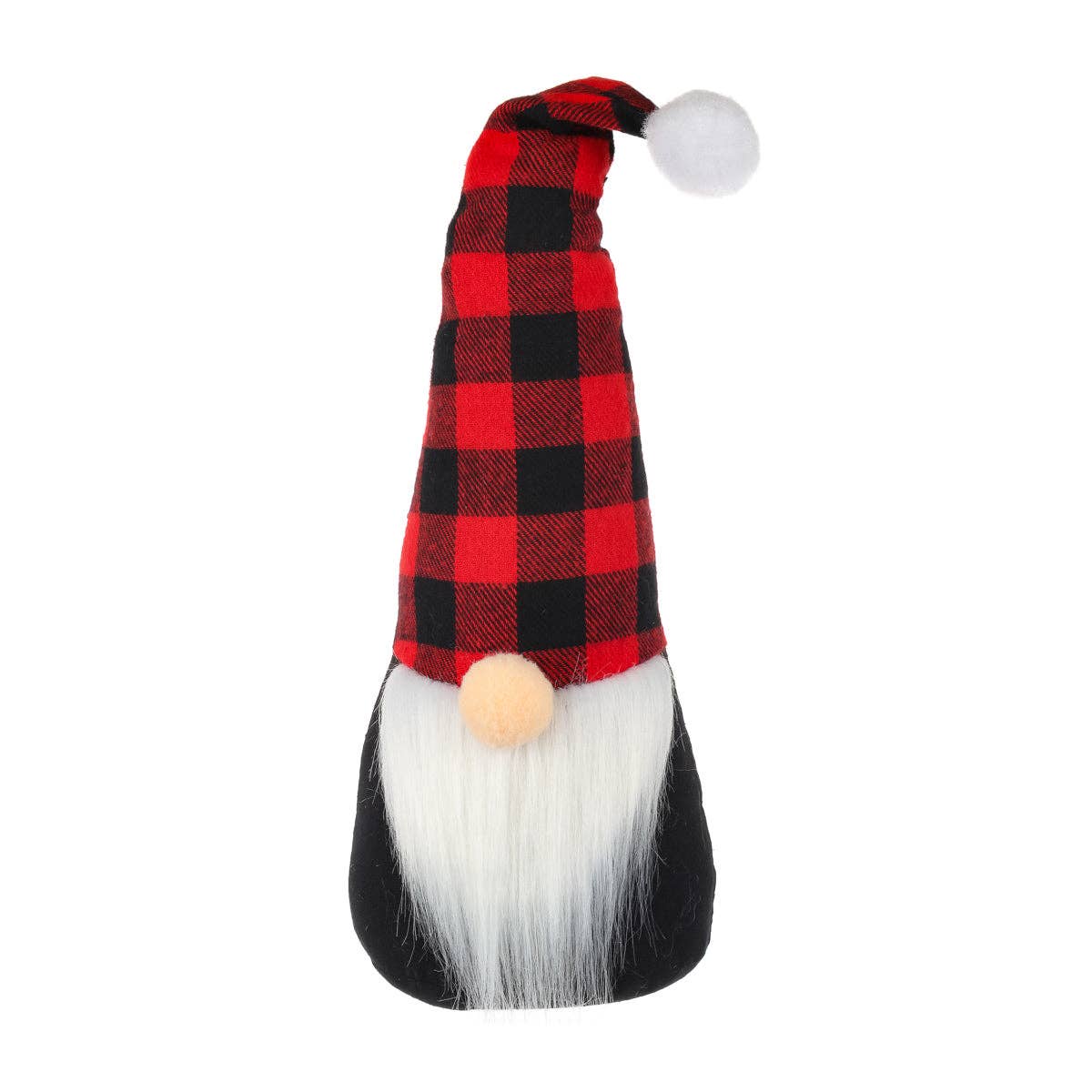 The Sitting Plaid Santa Gnome is a decorative plush figurine made of long, fuzzy white fabric. The gnome has a round nose, black shoes, and features a tall, pointed hat made of red and gray plaid fabric, complete with a posable interior wire. The bottom of the gnome is weighted with beads for a secure sitting display, bringing a festive and charming touch to a shelf or table during the Winter and Christmas season. Measures 18” high by 6.5” wide by 5.5” deep.