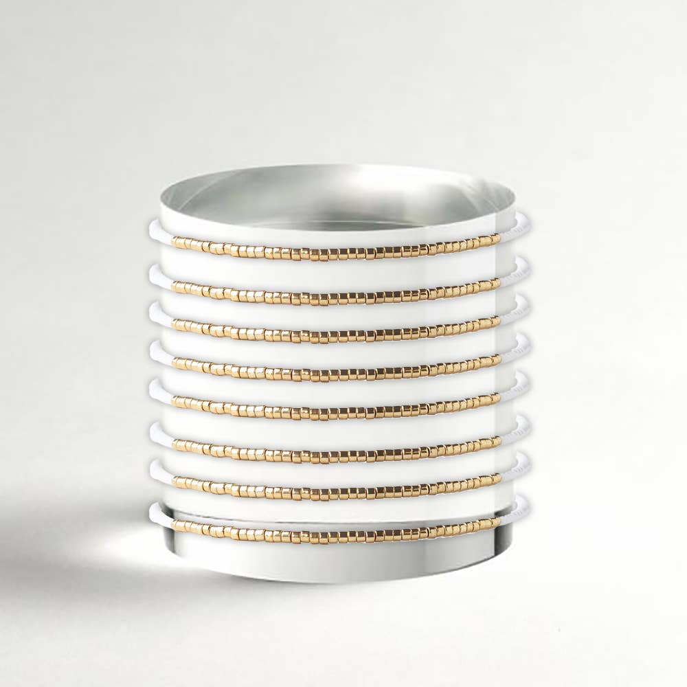 Paradise Tila Bracelet Expertly designed and crafted, the Paradise Tila Bracelet features a stunning combination of clear and gold Miyuki Tila beads. Handcrafted in the USA by a skilled Coast and Cove Artist, each bracelet is approximately 6.5 inches and designed with a unique pattern that sets it apart from the rest. With a stretch bracelet design, it's easy to wear and perfect for any occasion.