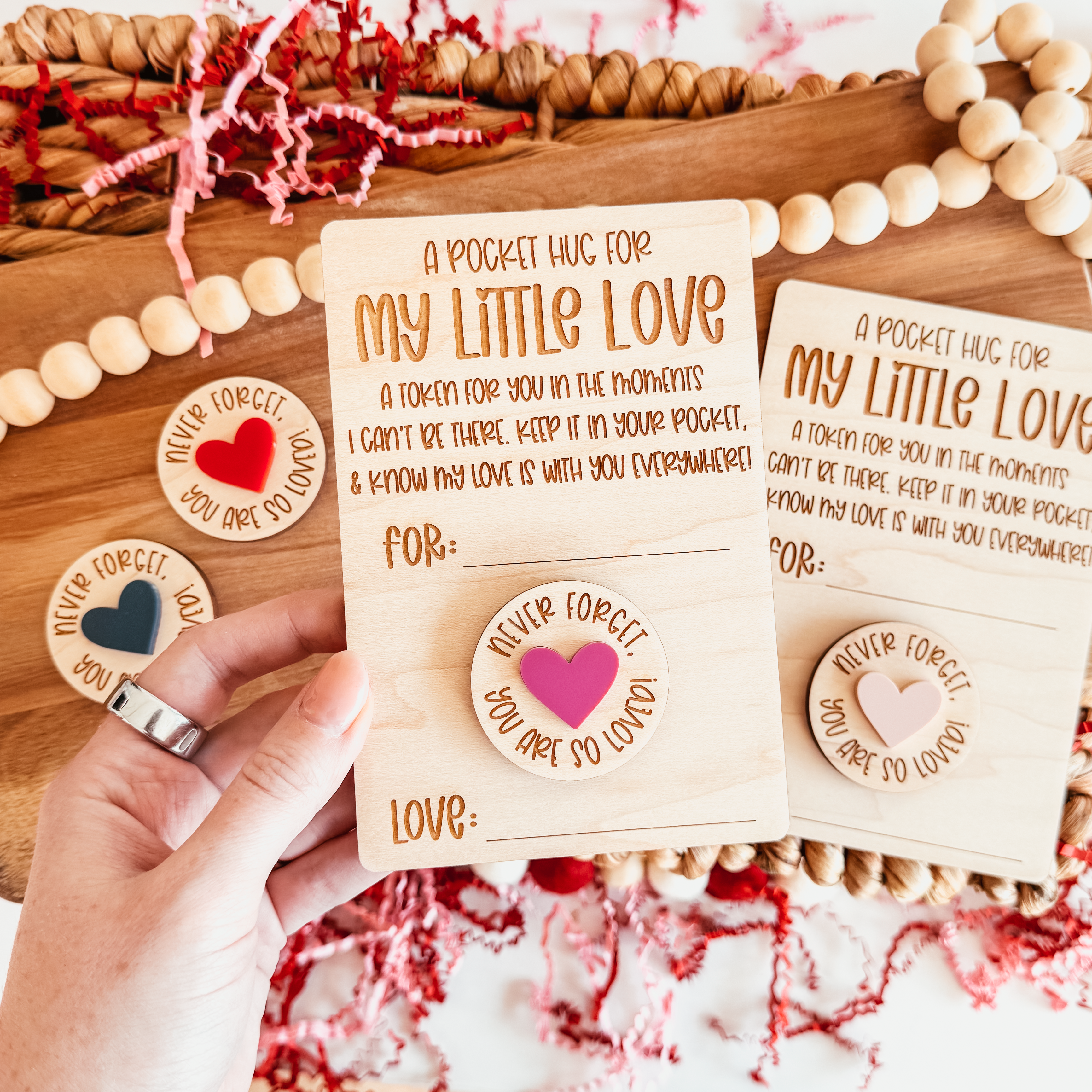 This cute little wooden Pocket Hug token is the perfect little gift to let someone know you care! Gifting ideas: *Tucked into a child’s lunch box, backpack, or purse *First day of school gift *Snuck into a friends bag or desk *Added to a gift bag or basket *A going away gift for a special person. Pocket Hug measures about 1.5” Card backing is a standard business card size of 3.5 inches wide by 2 inches tall and printed on eco-friendly recycled paper. Each pocket hug is individually packaged.