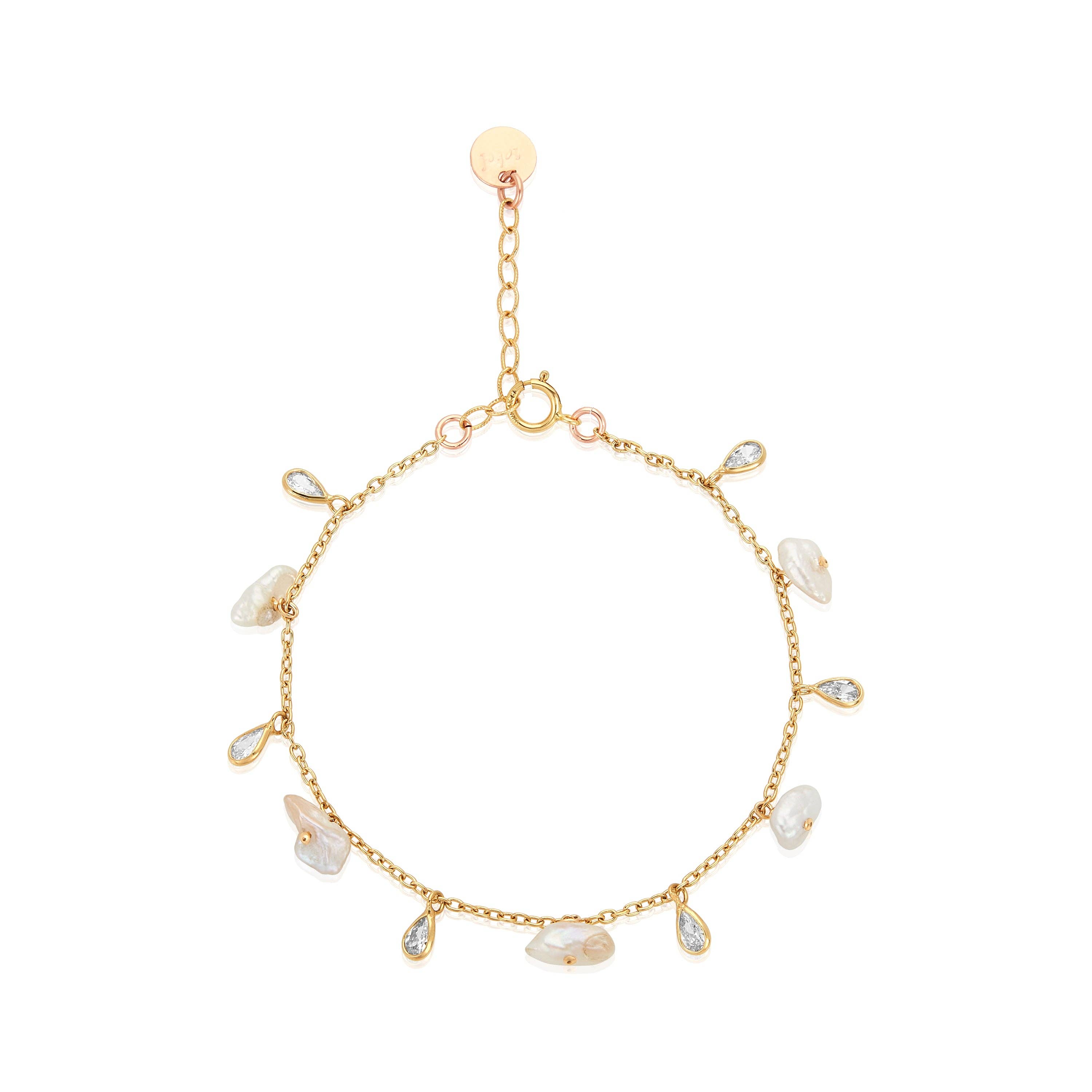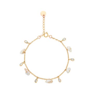 Inspired by the transition of the waxing and waning moon; rose quartz is embedded in brass and paired with hand sculpted charms on our signature chain with a handmade clasp to create this bracelet. Charm width 1/2 in Bracelet Length 7" - 7 5/8" adjustable This piece is handmade-to-order. Each piece will vary slightly due to the uniqueness of the stones. All metal is nickel free. Material: brass, metal, semi-precious, stone, gemstone, recycled.