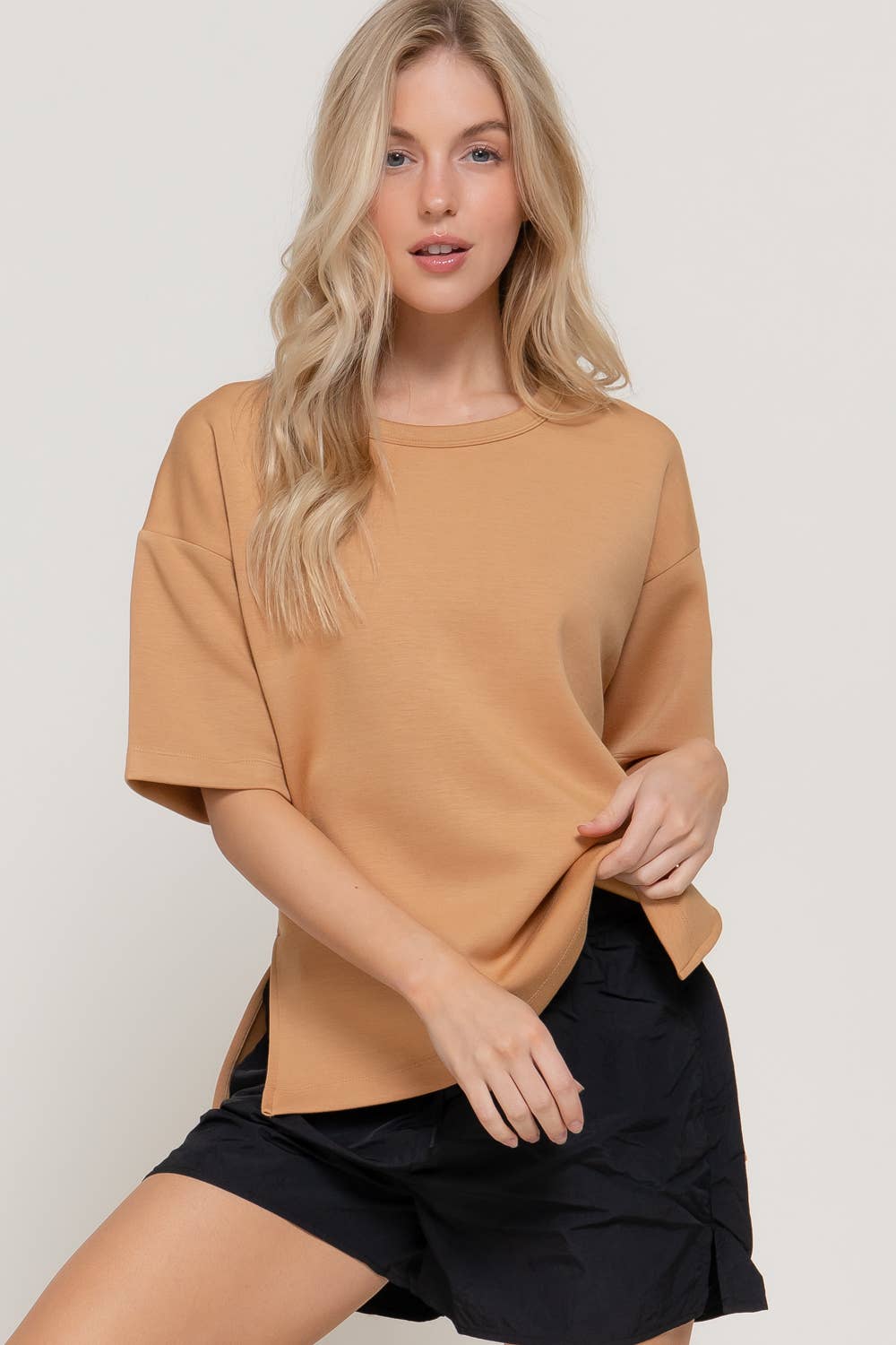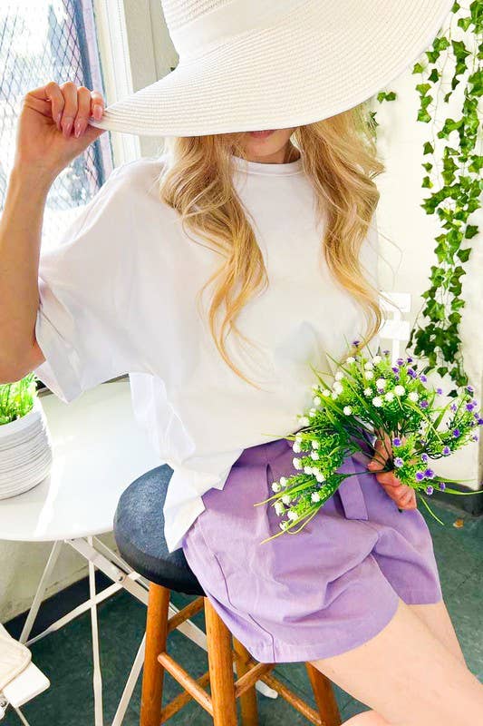 - V-neckline with neckband - Casual drop shoulder - Short Dolman roll-up sleeve - Side seam slit detail - Pullover style construction - 50%Polyester 31%Cotton 19%Rayon Cupro-fabric - High and Low hem - Comfortable, relaxed fit - Lightweight and breathable for spring, summer, and fall, 13 colors, casual - Every day, outgoing, vacation, errands, work, beach, home - Style with VP81178, VP83031 * Model is 5'8, 32-27-37, wearing SMALL