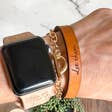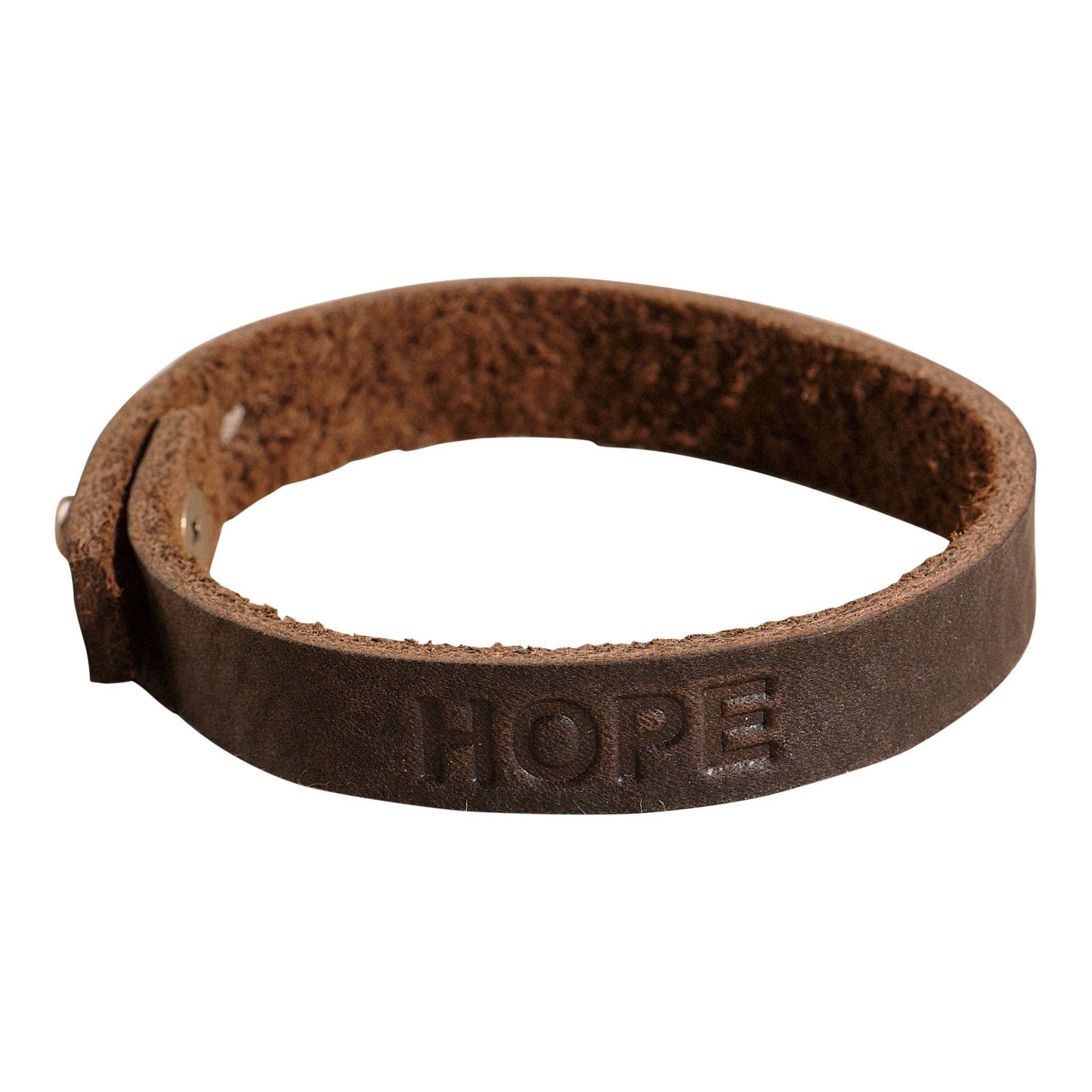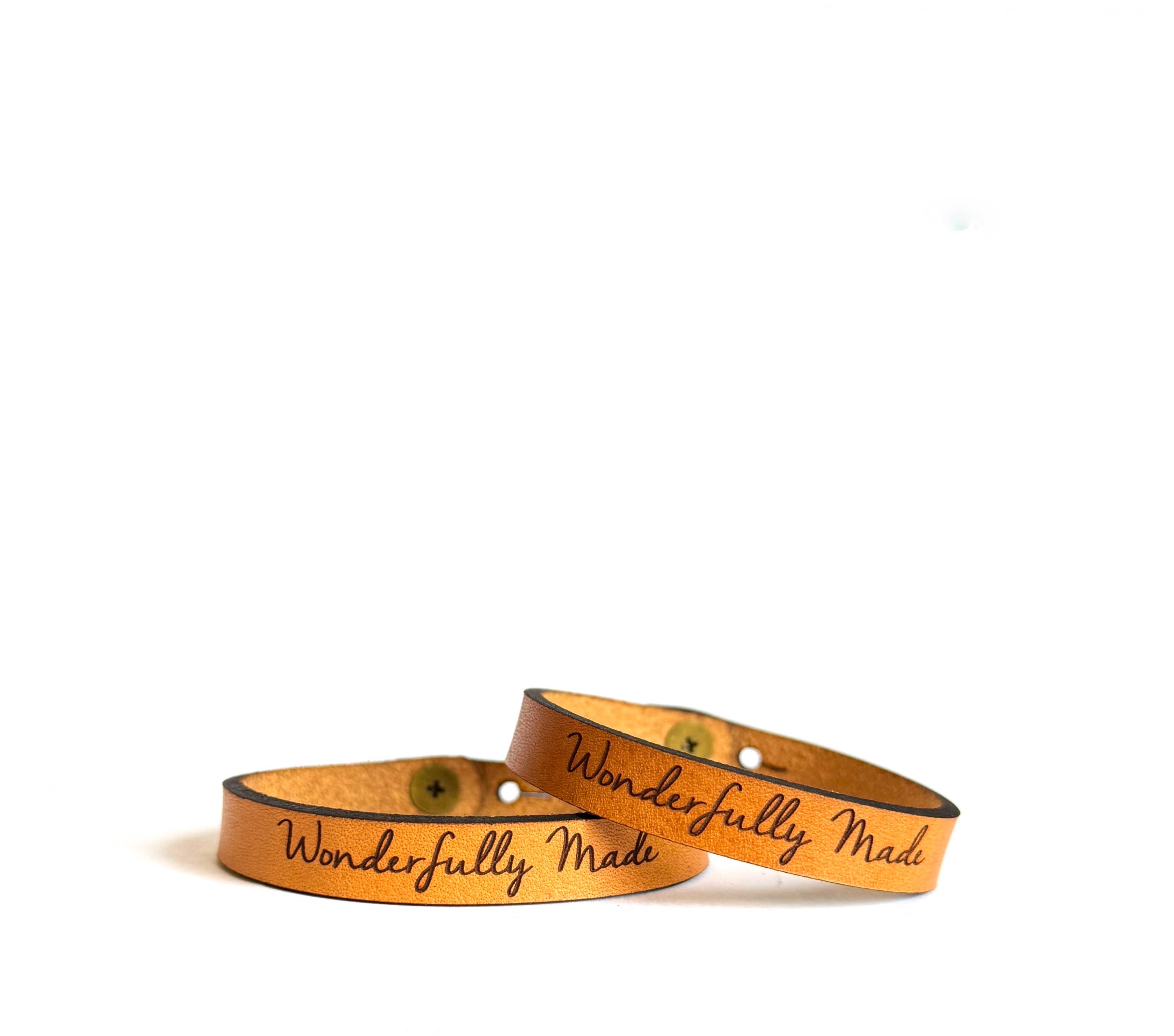 Full grain leather bracelet engraved with the wording "Let Them". Stacks well with design bracelets. Font is Backhome, you can also order in a different font. This classic style leather bracelet is perfect for stacking with each other or any bracelet! Made from full grain leather from our local leather shop. We personally cut and engrave each bracelet. Closure is a button stud, and adjustable. The leather is soft, comfortable and lightweight, making it great for everyday wear. Each piece of leather is different, please allow for slight differences in appearance, making each one unique. Size of 2 settings is 7" & 7 1/2". We can customize sizing. Width is .4"