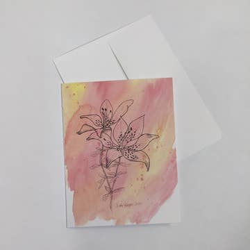 This Western Trillium greeting card measures 5.5"x4.25", is printed in my home studio on 100% recycled card stock paper, and is paired with a 100% recycled kraft brown envelope. Inside is blank. Cards can either be purchased packaging-free, or individually packaged in clear plant-based PLA "plastic" open-ended sleeves for protection while on display. The back reads: Found throughout the west where rich mixed conifer forests exist, western trillium are one of the earliest wildflowers you can spot on a walk through the woods. Pollinators like bumble bees, moths, and beetles all appreciate this early bloomer. Try growing this charming plant at home in a shady, moist spot.
