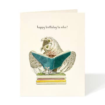 A hand drawn bunny in graphite carrying hand painted books text reads "I hope your birthday is a real page turner". Details: Size - 4.25”x 5.5”. Printed on soft white paper and paired with a matching soft white envelope. Blank interior for personal message.