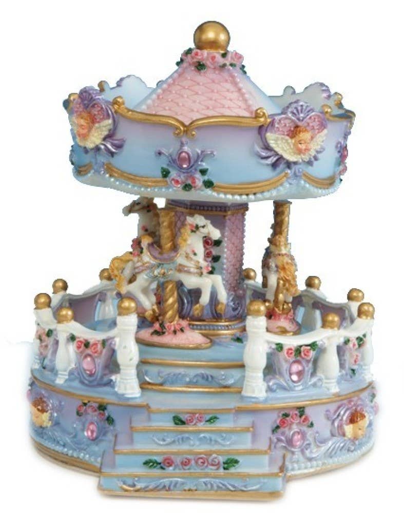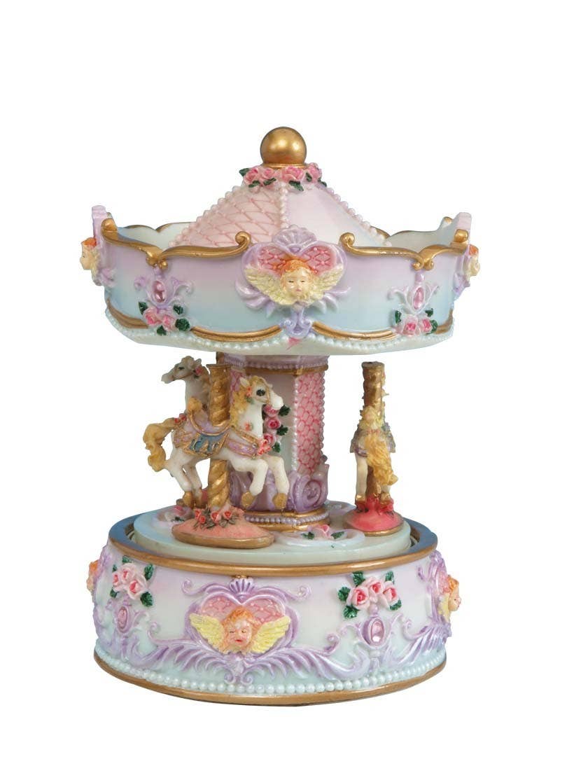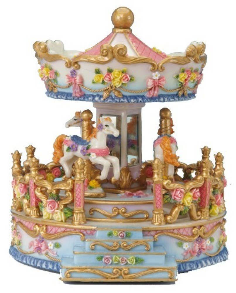 Snow globe with carousel horse. In the ball filled with glitter and snow, the carousel horse is standing on the decorated gold pole. The base is decorated and painted and in the base, there is a wheel with various horse motifs. When the switch is turned on, the snow is whirled up automatically, the horse in the ball and the wheel in the base turn, the horse is illuminated from below, and 8 Christmas melodies play (Jingle Bells, Joy to the World, We wish you a merry Christmas, The first noel, Silent night, Hark! The angel singing, Deck the halls, Oh Christmas tree). Battery operated 2xAA. Batteries are not included. Diameter 5.9 inches.