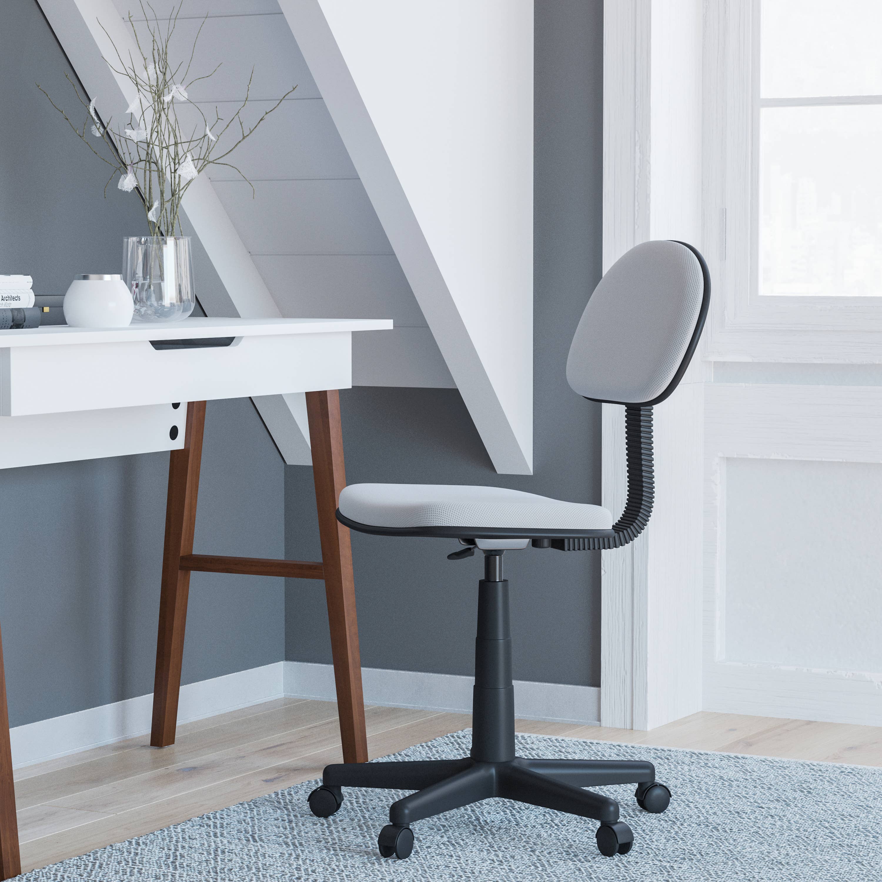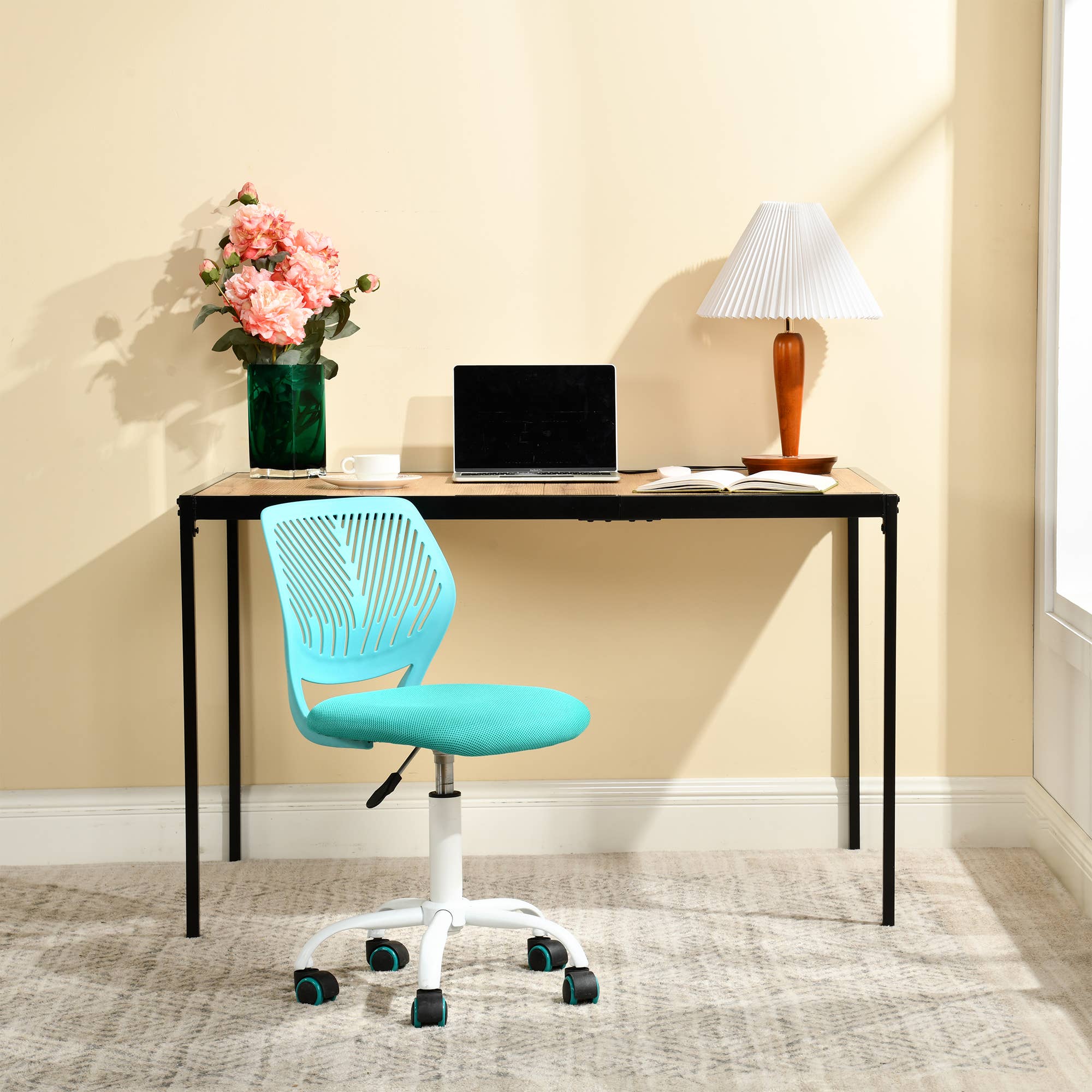 This is the perfect computer desk chair for teenagers while they do their homework. Cute, beautiful, colorful, and comfortable. Five caster wheels make it easy to move from one task to the next. The adjustable swivel seat is upholstered in a variety of fun colors, and thick padding with a double-layer breathable mesh seat will keep you cool and comfortable. It is easy to put together, affordable and perfect for small spaces. Key Features: -Included in the box: 1 x desk chair, hardware fitting bag, manual instruction -Materials: Plastic, PP, mesh/fabric, metal -360-degree swivel to sit and spin -Breathable mesh fabric seat for longevity and keep you cool -Colourful casters suitable for hardwood or carpeted floors -Perfect task chair for home study. -Chair back style: Mid-Back -Overall Dimensions: 17.7" W x 15.2" D x 29.5-34.2" H