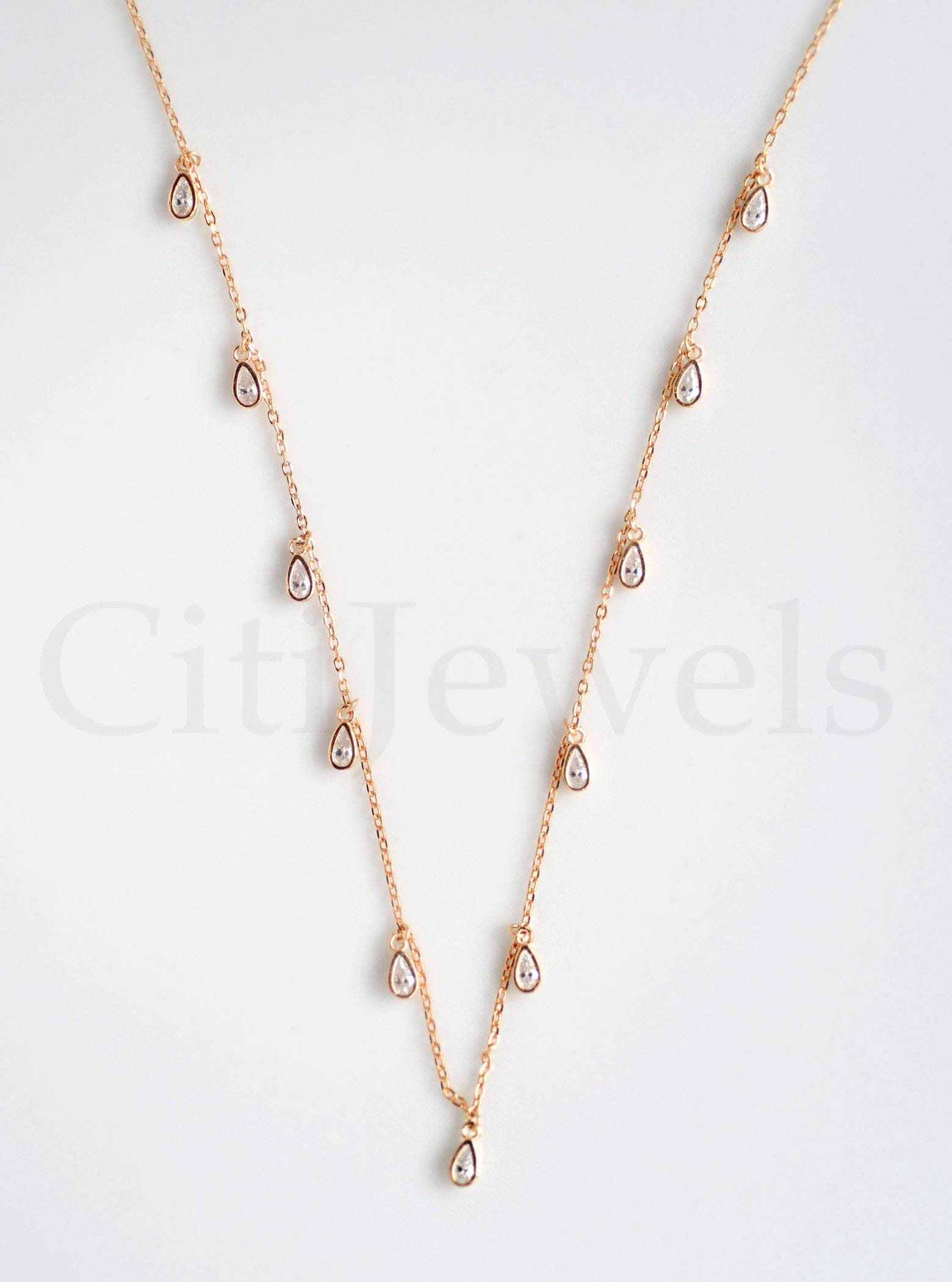 Station Necklace with CZs, Gold Plated Sterling Silver or Sterling Silver.A Simple yet elegant staple that transitions well from day to night.Chain Length: 14" Material: 18 Karat Gold Filled, Hypoallergenic, Nickel-freeHandmade with Love in the USA.18 Karat Gold Filled does not de-laminate or peel like Gold plated Jewelry nor does it tarnish as readily. Generally speaking, gold filled is better quality and will have a much longer lasting color than plated jewelry. To clean gold-filled it is best to use mild soap and water.