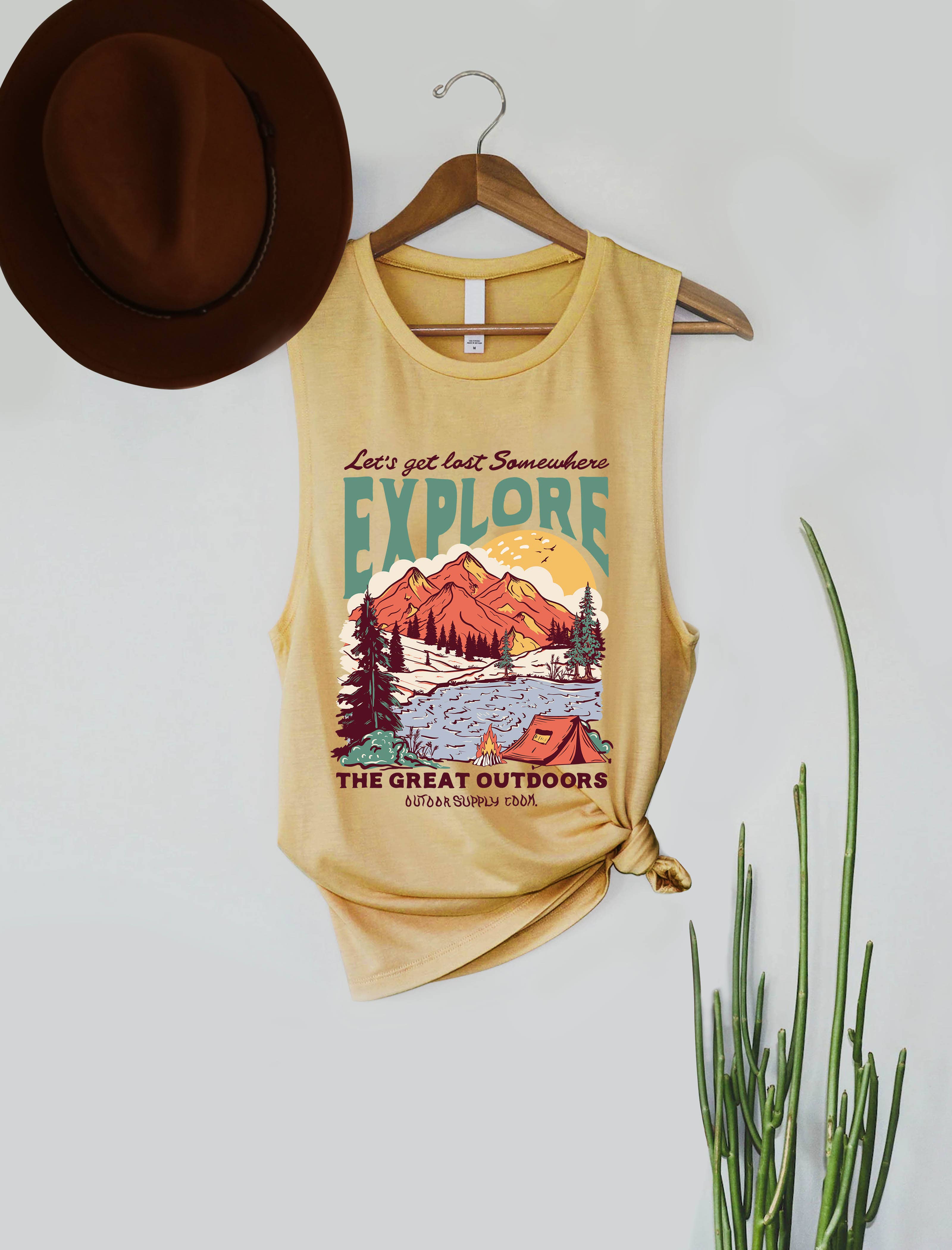 Our Let's Go Camping Mountain Fireside Graphic Sun Flowy Tank Top is perfect for those who love the great outdoors and camping adventures. White and Peach are 65/35 polyester/viscose. Marble is 91/9 poly/cotton. Available in a range of sizes and colors, this tank is perfect for camping trips, hiking adventures, and casual outings. It's durable, easy to care for, and makes a great gift for anyone who loves the outdoors. Order yours today and get ready to hit the trails! By Kissed Apparel.