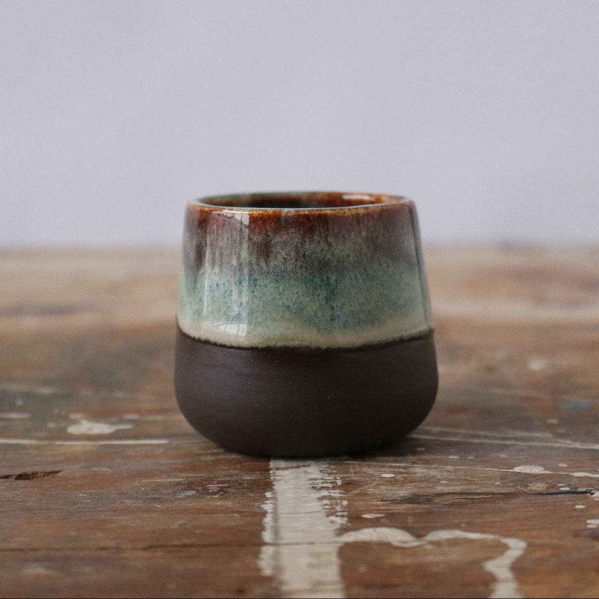 Two-glaze, stackable mug. Holds 6 oz. Stoneware. Speckled Clay. Microwave and Dishwasher Safe.
