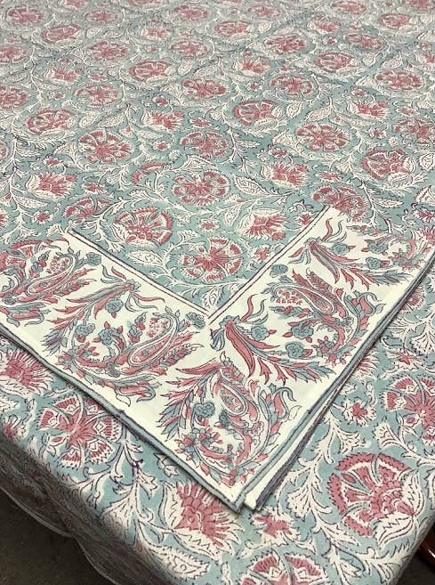 Handblock printed table cloths. 100% cotton Color: block tablecloth. Size: 60x90. Material/fabric content: 100% cotton. Care: machine wash cold. Gentle cycle. Do not bleach. Air dry.