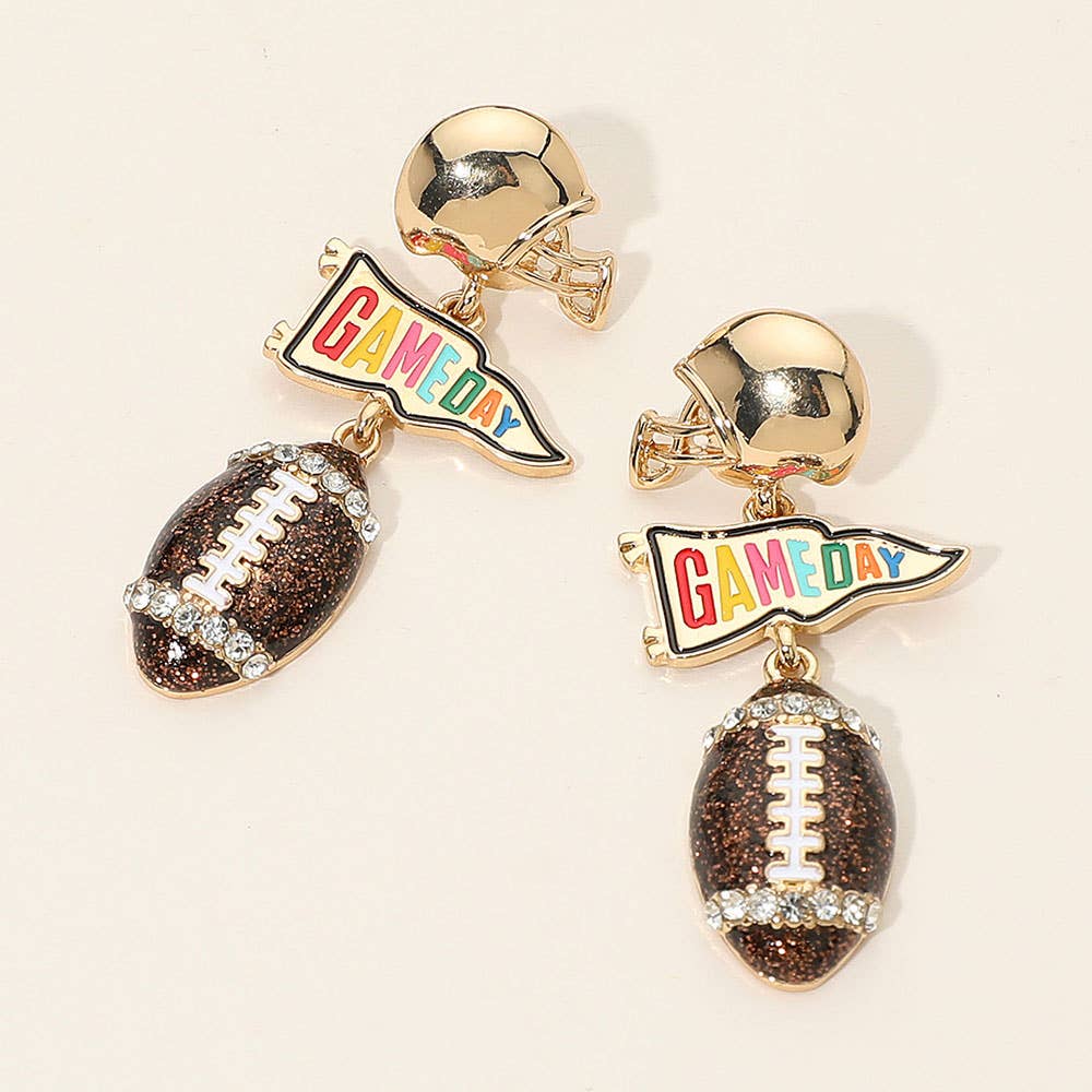 Show off your love for football in style with these Glitter Football Helmet Dangle Earrings from Prep Obsessed Wholesale. The black and gold design is a standout addition to any game day outfit. These earrings are 2.50"L, lead & nickel compliant, ensuring comfort and safety. Let your love for the sport shine through in a fashionable way with these unique dangle earrings.